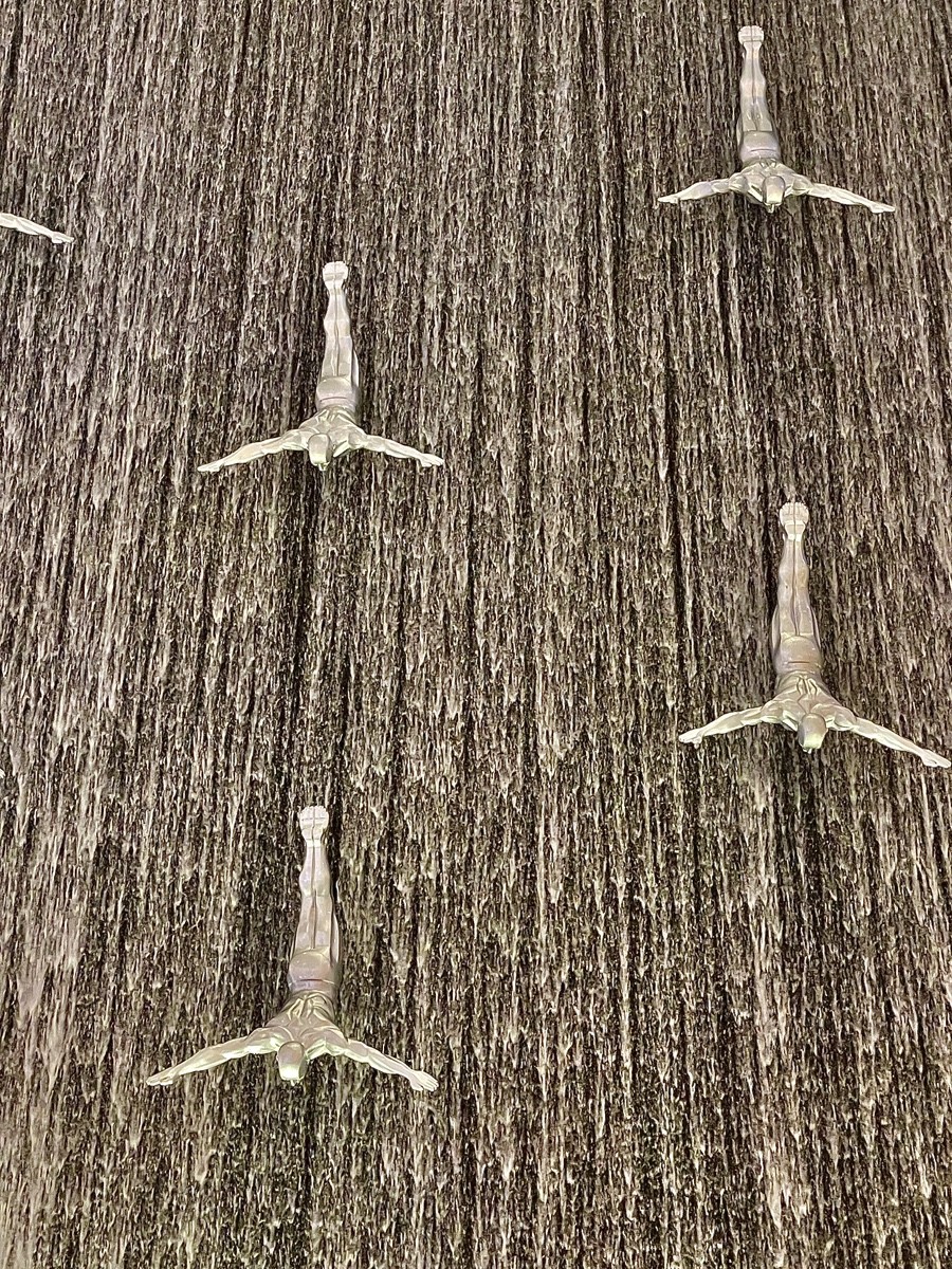 Фигуры выполнены из **стекловолокна**, каждая — в разной позе, но с одинаково раскинутыми руками, как у парашютистов. Их несколько десятков, и они намеренно лишены индивидуальных черт: это не конкретные люди, а обобщённый образ движения вниз. В контексте Дубая, города роста, высоты и подъёма, этот мотив читается особенно сильно — как редкий жест в сторону противоположного направления.