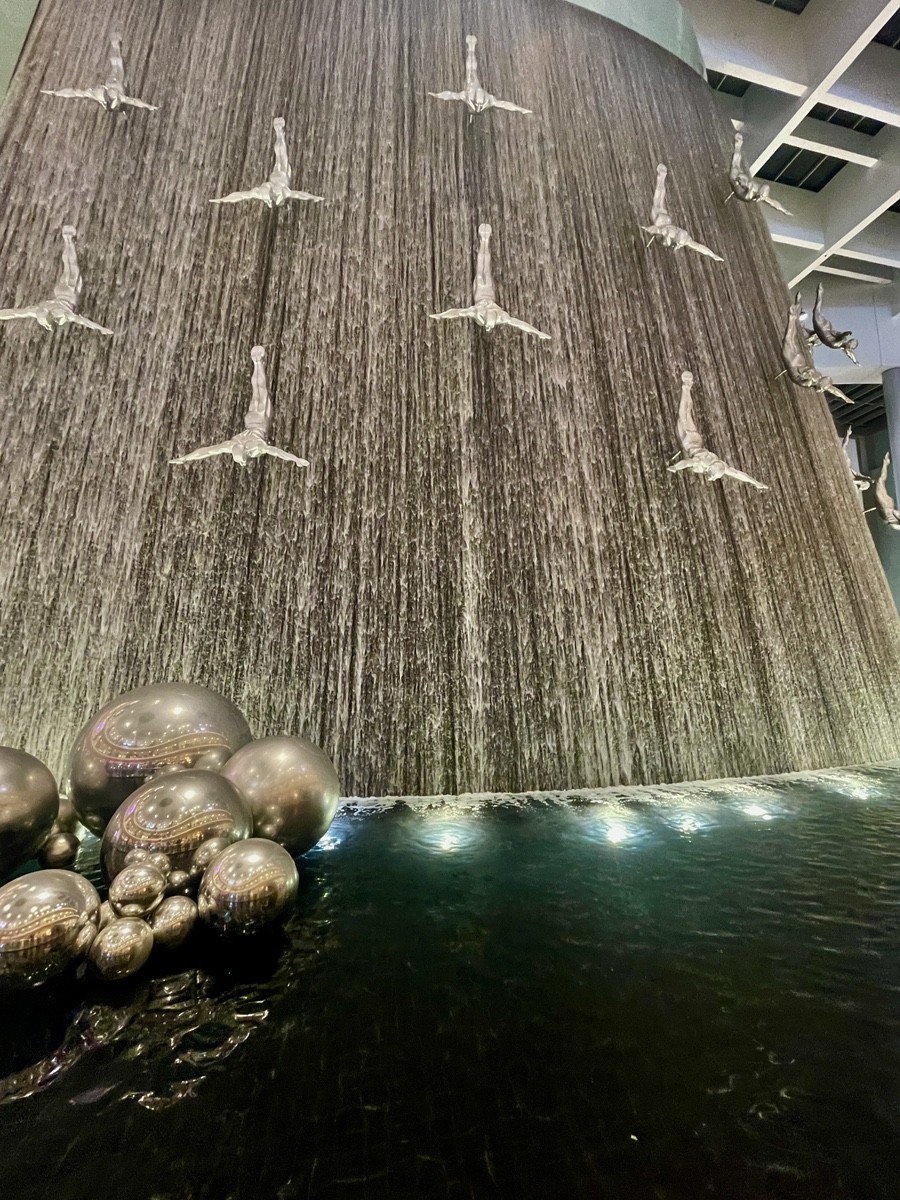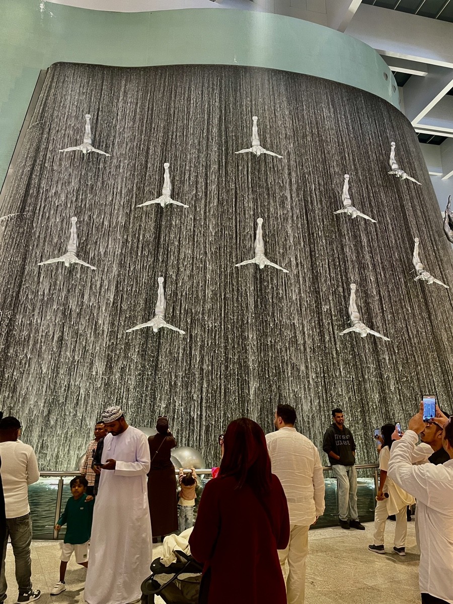 Dubai Mall Waterfall — одно из немногих мест в Dubai Mall, где движение останавливается само. Высокая стена с падающей водой тянется через несколько этажей, а на её фоне — человеческие фигуры, застывшие в моменте прыжка или падения. Это не шоу и не аттракцион, а постоянная сцена, встроенная прямо в архитектуру.