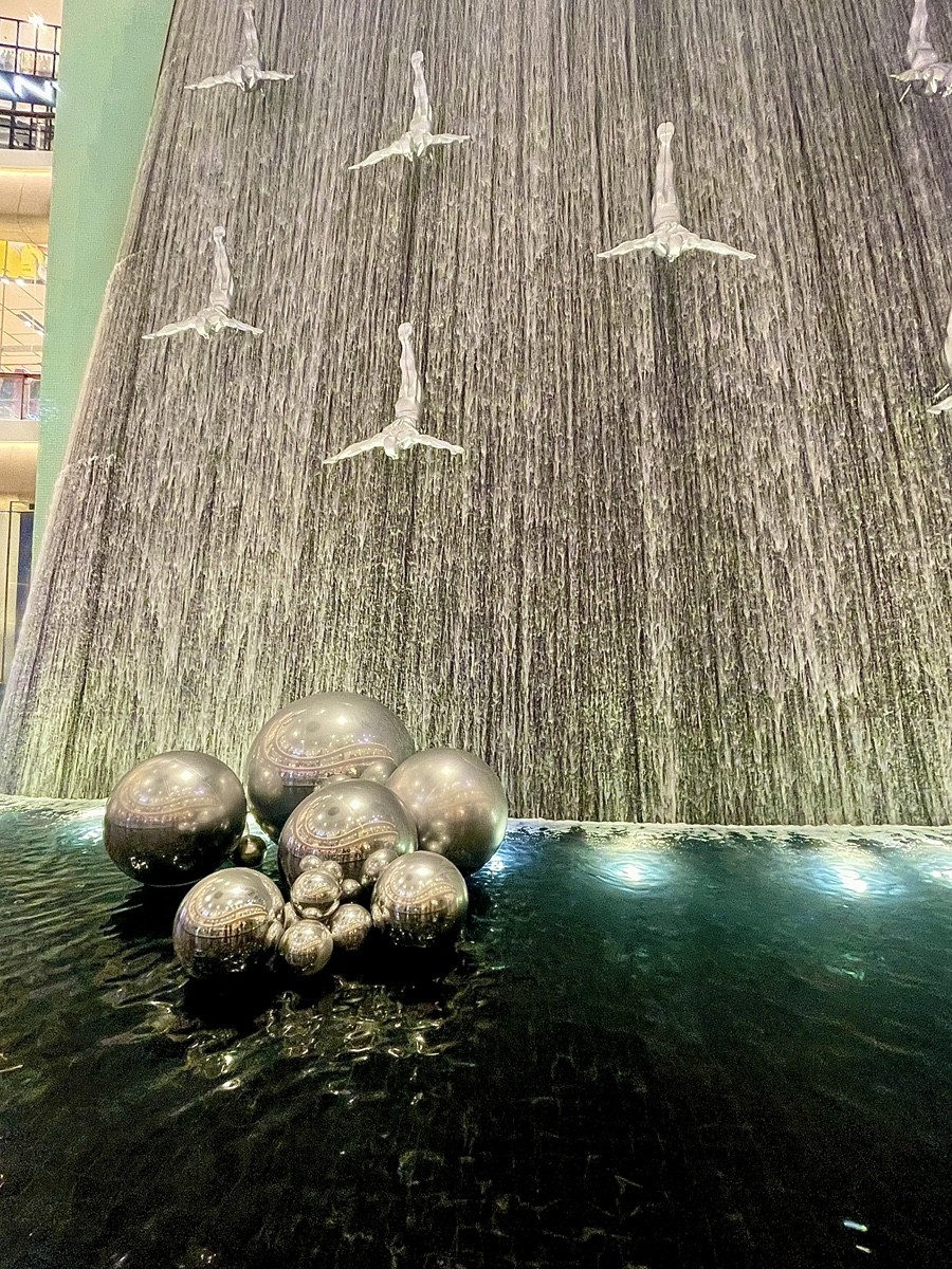 Водопад расположен в одном из центральных атриумов молла и поднимается примерно на **24 метра**, охватывая сразу **четыре уровня**. Вода стекает непрерывно, тонкими струями, создавая ровный шум, который резко контрастирует с обычным звуковым фоном торгового центра. Именно поэтому здесь часто задерживаются дольше, чем планировали.