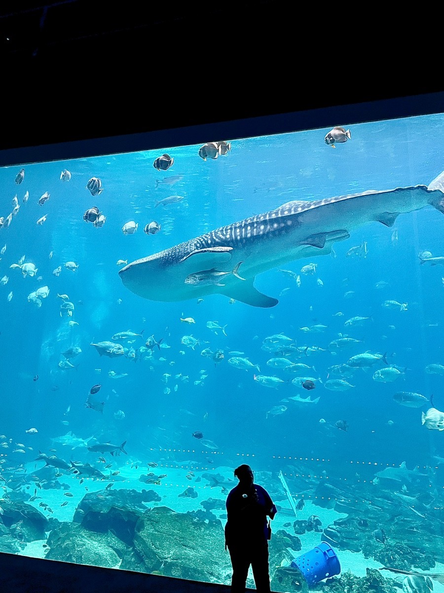 For comparison: – Georgia Aquarium (Atlanta, USA) — window ~18 m wide, 7 m tall, acrylic thickness ~60 cm; the only aquarium in the U.S. with whale sharks. – Churaumi Aquarium (Okinawa, Japan) — “Kuroshio Sea” window ~22.5 m wide, 8.5 m tall, acrylic thickness ~60 cm; home to whale sharks in Asia.