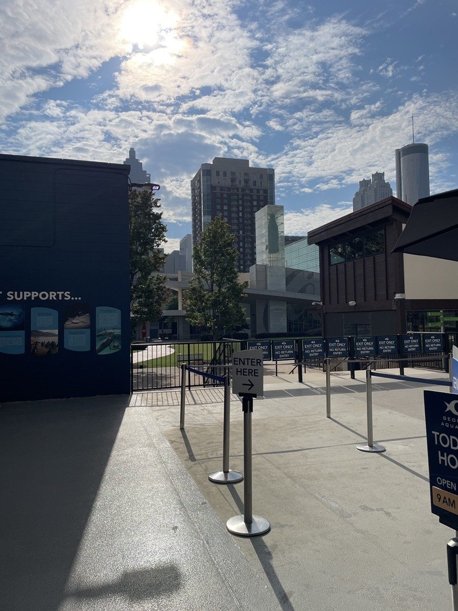 Stepping out of the covered walkway, visitors arrive at Pemberton Place, where the main entrance to the Georgia Aquarium dominates the square. Signs marked “Enter Here” and guiding barriers direct the flow toward ticket counters and security, keeping the process smooth and organized.