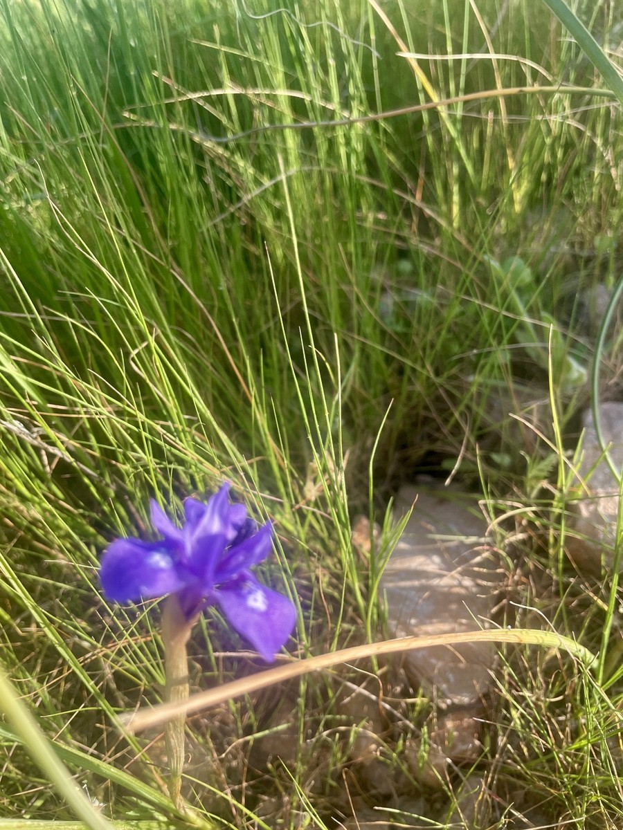 Ирис ситниковый (Gynandriris sisyrinchium), который в Израиле называют Ирисом послеполуденным (Цохорием). Это удивительный цветок с характером, и вот почему: Почему он «Послеполуденный»? Это его самая главная особенность. Цветок открывается строго в определенное время — обычно после 12:00–13:00, а к вечеру уже увядает. Если прийти на то же поле утром, вы увидите только зеленые стебли, похожие на траву, и не догадаетесь, что там растут ирисы. Насыщенный фиолетовый или ярко-синий с характерным белым или желтым пятном в центре лепестков (этот рисунок служит «мишенью» для опылителей). Он очень неприхотлив, растет на каменистых почвах, вытоптанных полях и пустырях, что объясняет его присутствие в районе карьера Нахаль Раба.