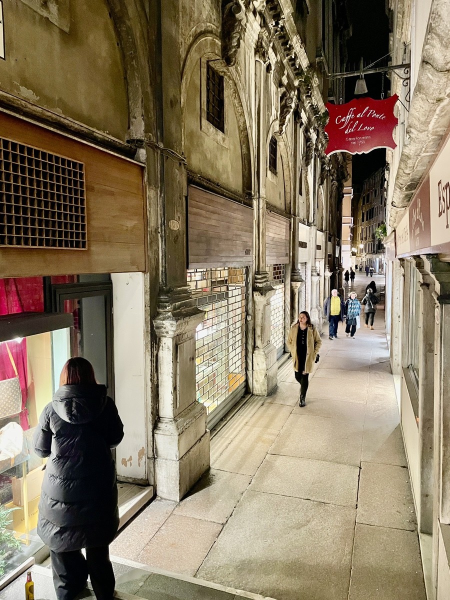 Мы движемся вдоль Гранд-канала к рыбному рынку Риальто (Pescaria). Зимой, в свете фонарей, его неоготические арки кажутся декорациями к таинственной пьесе. Это чрево Венеции, где веками шумят торговцы и где «язык камня» встречается с повседневной суетой. Пройдя через легендарный мост Риальто, мы попадаем в самое сердце коммерции, где банковские палаццо соседствуют с крошечными лавками.