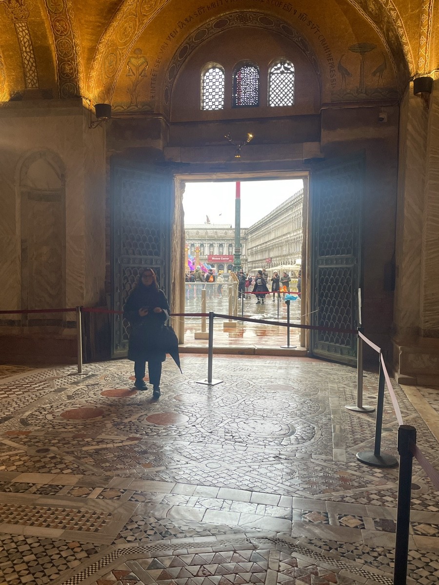 Стены притвора облицованы «раскрытым» мрамором: массивные блоки распиливались на тонкие пластины и соединялись краями, создавая симметричные узоры, напоминающие дым или волны. Красные вставки в полу — это символы императорской власти. Согласно протоколу Республики, наступать на них имел право только дож или высшие сановники во время торжественных процессий. Надпись над входной аркой гласит: «Пусть входят в безопасности те, кто идет путем покаяния… кто не обременен преступлением». Это было прямое юридическое напоминание: за этим порогом мирские законы уступали место божественному суду.