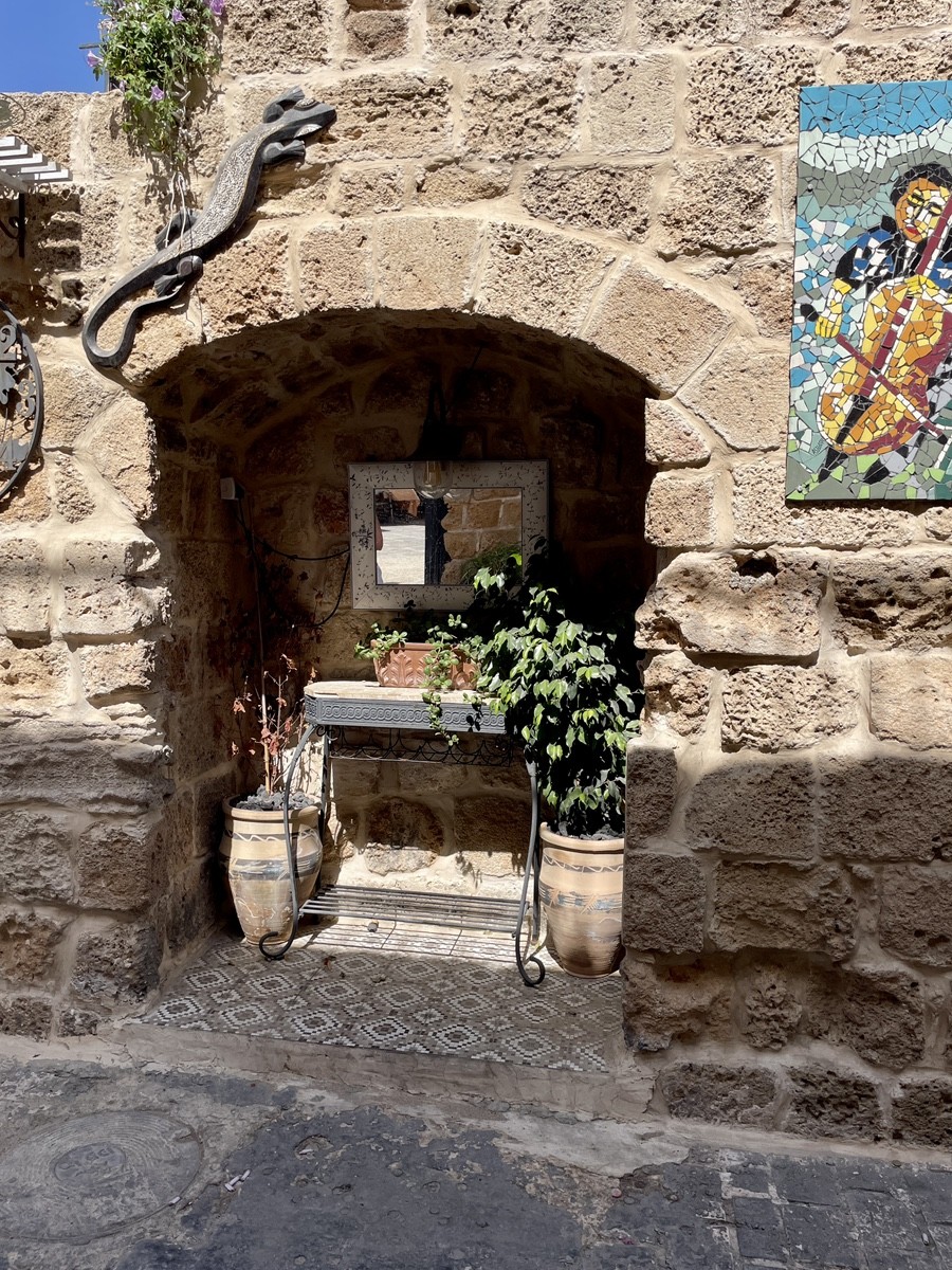Эта улица — как раз такая. Она возникла на руинах кварталов крестоносцев, которые после разрушений больше никогда не были восстановлены полностью. Сегодня городские власти Акко нашли способ вдохнуть сюда жизнь: среди древних камней появились арт-объекты, цветы, зеркала, фрагменты керамики и символы моря — якоря, штурвалы, зелень, словно прорастающая сквозь время.