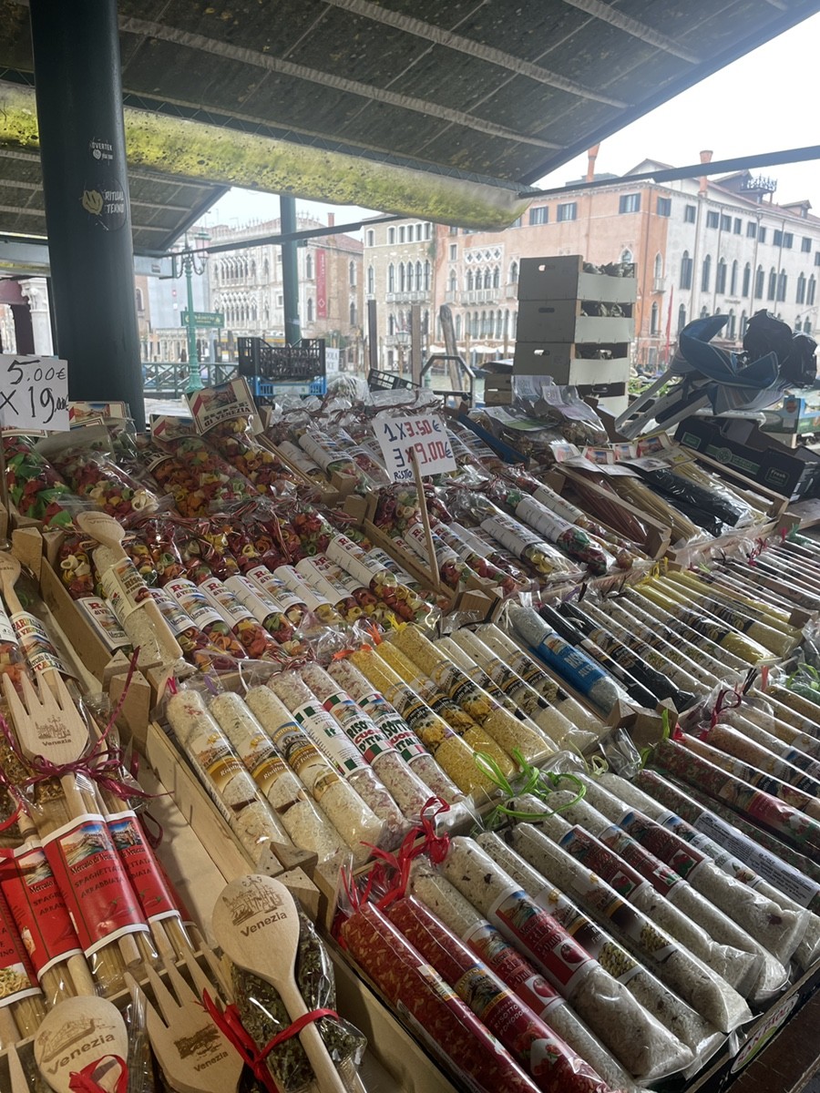 Классический ассортимент «туристического» Риальто. Это готовые наборы, которые превращают венецианскую кухню в удобный сувенир. Эти длинные пакеты со специями, сушеными овощами и пастой (или рисом) — местный хит. Внутри смеси типа Spaghettata (обычно это чеснок, острый перец пеперончино, петрушка и иногда сушеные томаты). Нужно просто обжарить смесь в масле и добавить в отваренные макароны. Видны упаковки с рисом сортов Карнароли или Арборио, уже смешанные с сушеными белыми грибами (Porcini) или чернилами каракатицы. Это способ привезти вкус венецианского ресторана к себе на кухню.