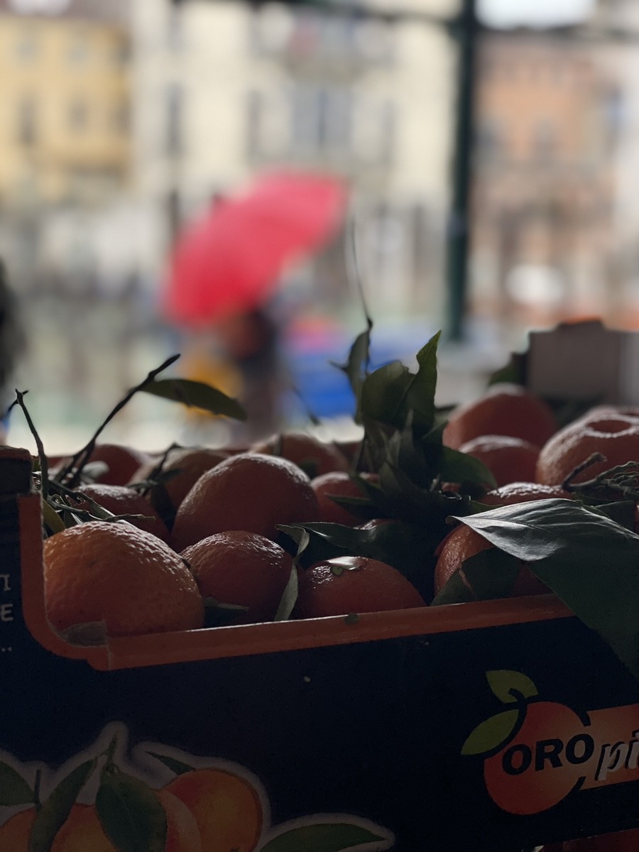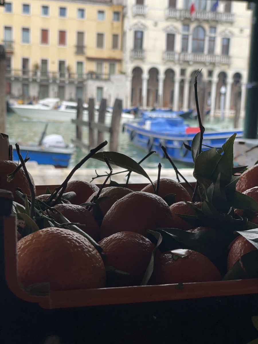 Мандарины у воды - очень «венецианский» кадр. Мандарины с листочками — верный признак того, что их не везли через полмира, а сорвали совсем недавно, скорее всего, на юге Италии или на Сицилии. В Венеции их ценят за аромат, который разносится по всему рынку.