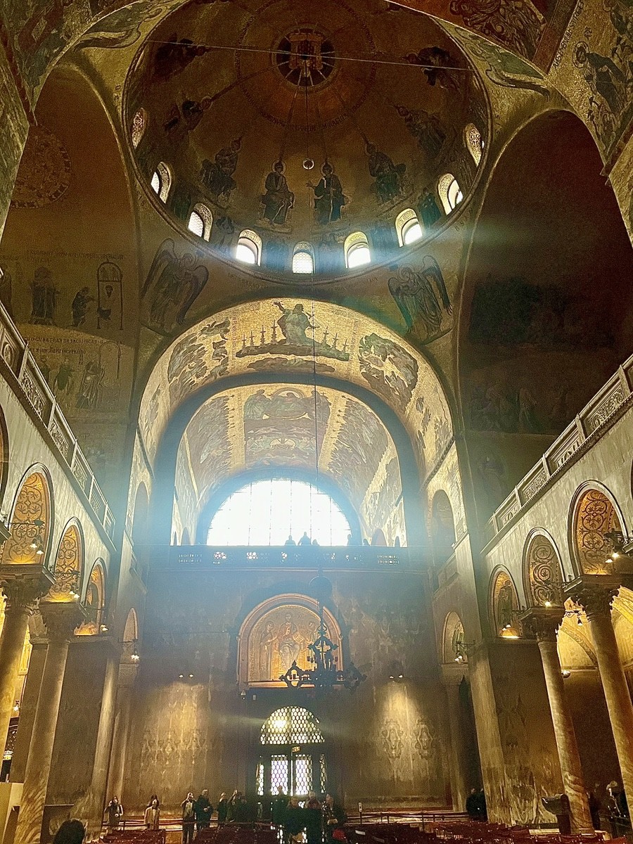 Кульминация маршрута на площади Сан-Марко — в месте, где вода лагуны встречается с камнем и где карнавал, дождь и архитектура создают ощущение живой сцены. Отсюда путь ведёт внутрь St. Mark’s Basilica — храма, который веками собирался как драгоценная шкатулка из трофеев и историй: византийские колонны, мозаики из золотой смальты, алтарь Пала д’Оро, баптистерий дожей и тихие трансепты, где до сих пор чувствуется дыхание раннего христианства.