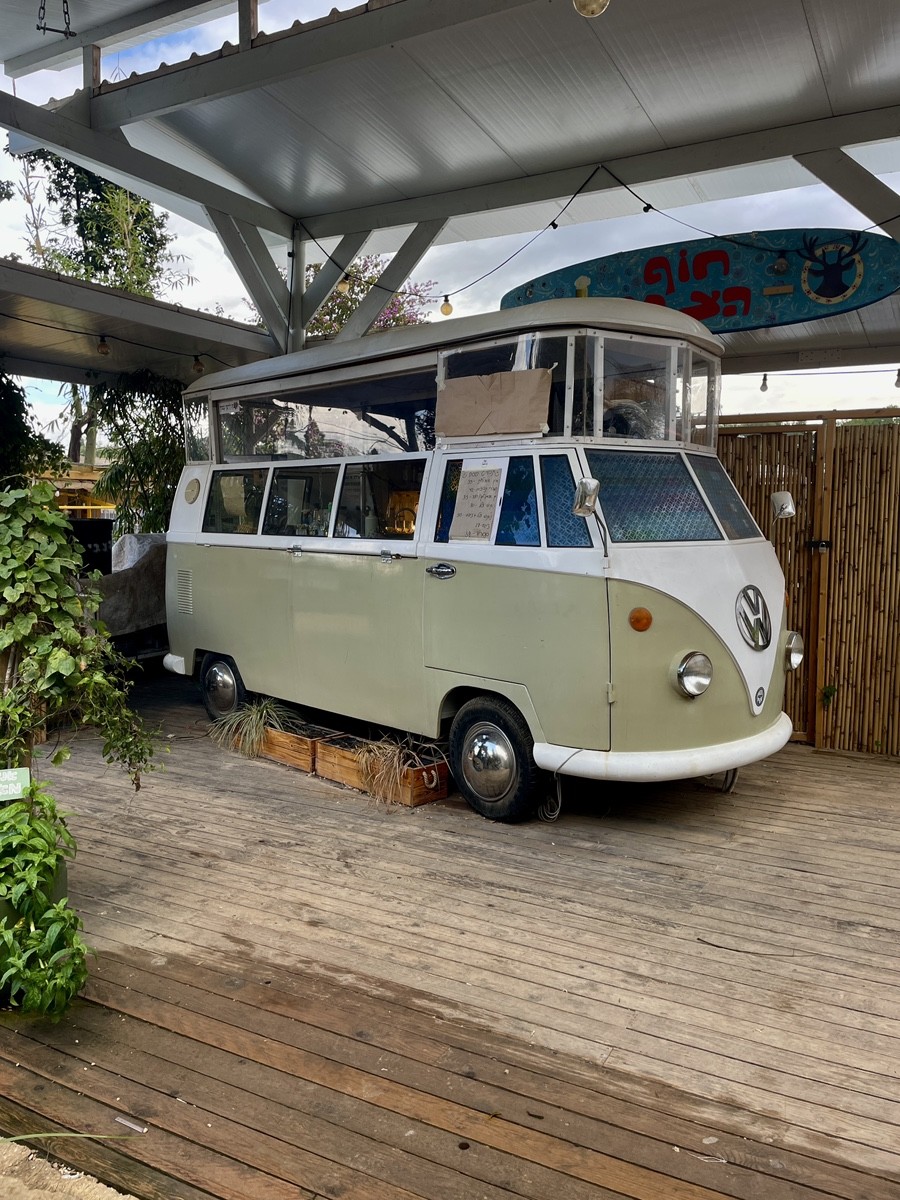 Это не просто фургончик, а винтажный автобус Volkswagen (Type 2), превращенный в передвижную (хотя теперь уже стационарную) кухню. Главная специализация — это мясо медленного копчения. Здесь готовят настоящий смоукер-брискет и рваную говядину, что само по себе редкость для такой богемной локации, как Пардес-Ханна.