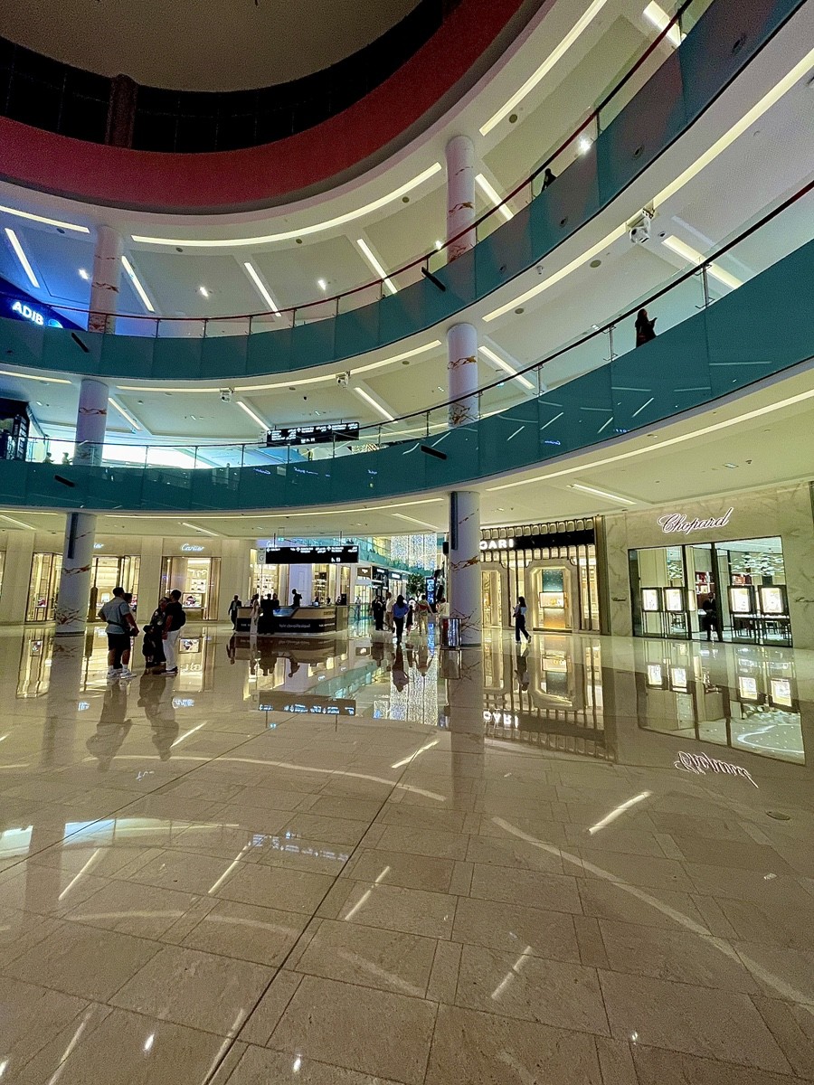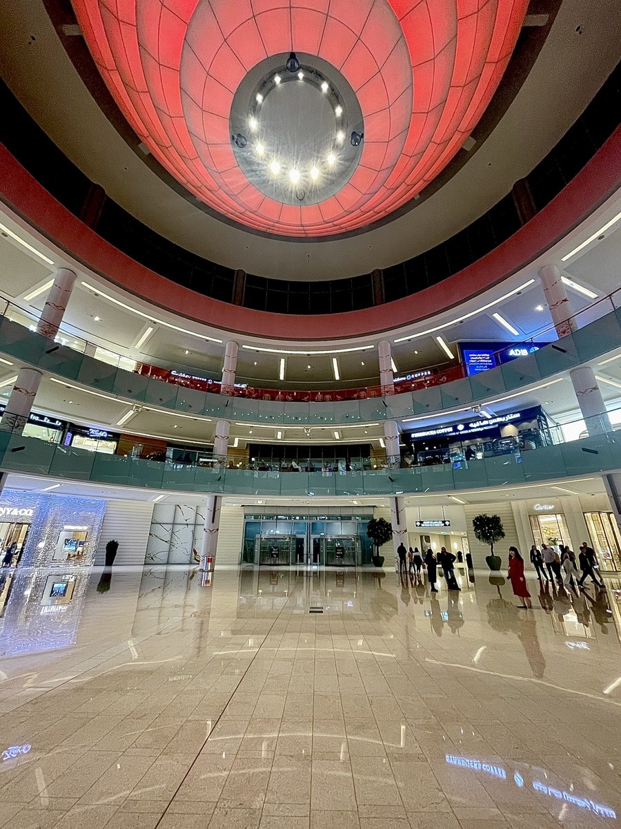 Это пространство внутри Dubai Mall сразу ощущается иначе. Широкий атриум, высокий круговой потолок с красным световым кольцом, гладкий мрамор и расстояние между людьми, которое здесь вдруг появляется. В отличие от плотных торговых коридоров, здесь есть воздух, пауза и ощущение масштаба, рассчитанного не на поток, а на присутствие.