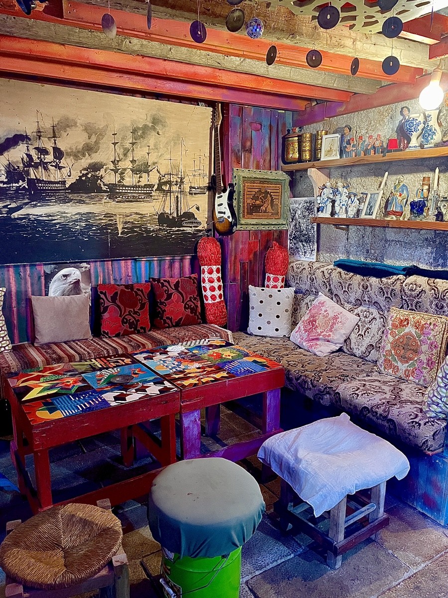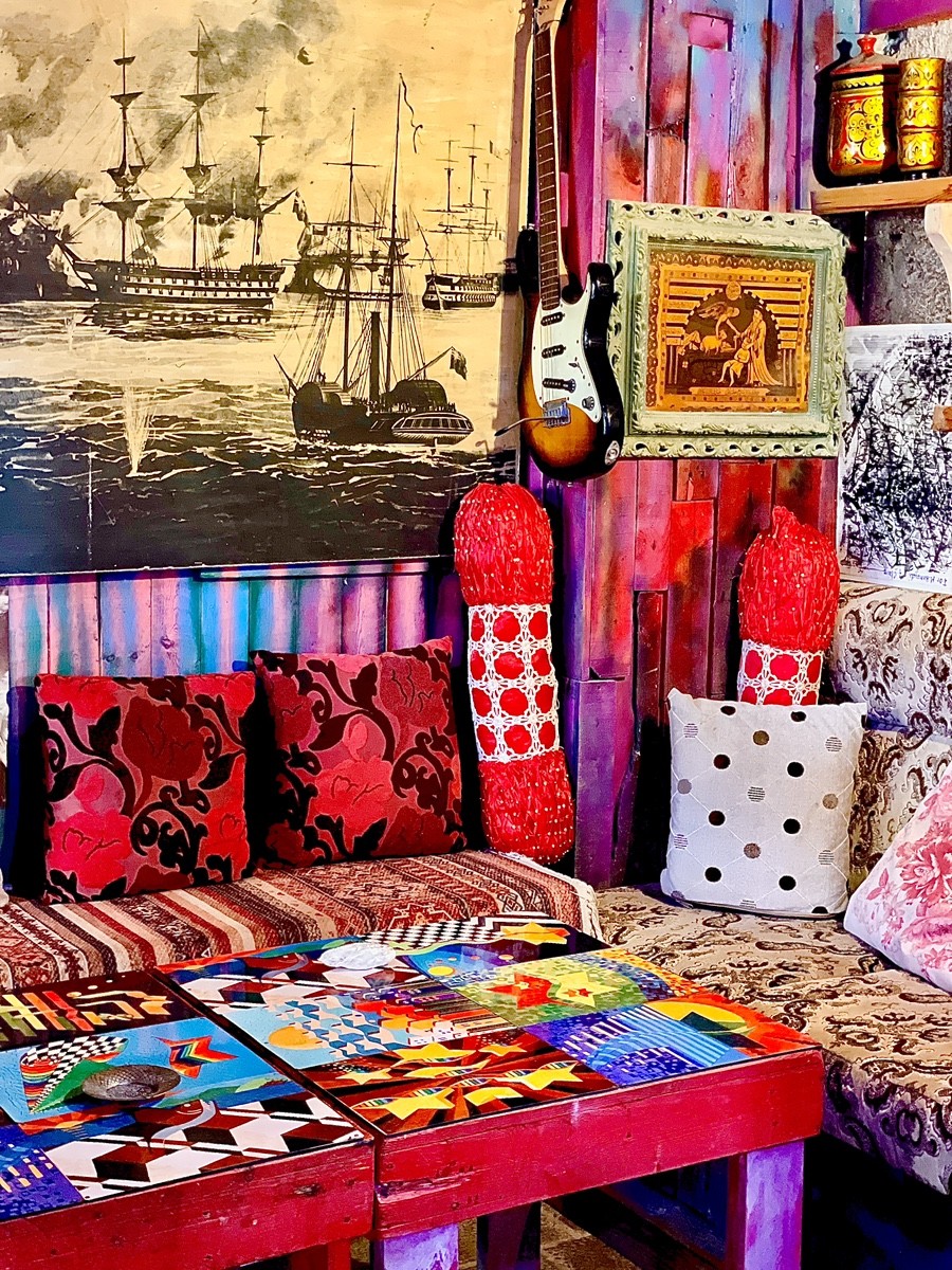 Его «Coffee Art» — не кафе, а живой коллаж из предметов, красок и воспоминаний. На стенах — чайники, ржавые кружки, башмаки, фотографии старого Акко, парусники и детские игрушки. За окном — расписанные ставни и морская соль, осевшая на стекле. Внутри — тёплый свет, запах кофе и старой меди. Здесь каждая вещь рассказывает о жизни у моря: о рыбаках, о кораблях, о людях, которые пьют чай и говорят о том, что море меняется, а город — нет.