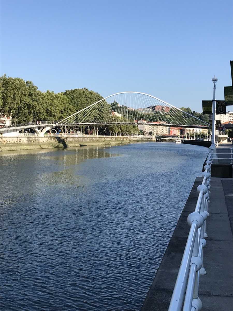 Чуть дальше над рекой взлетает изящная арка белого моста — это **Zubizuri**, что на баскском значит «Белый мост». Его спроектировал Сантьяго Калатрава — архитектор, инженер и поэт формы. Подвесные тросы, натянутые как струны арфы, создают ощущение полёта, а изогнутая палуба делает переход похожим на плавный взмах крыла. Калатрава задумывал его как символ соединения — между прошлым промышленным Бильбао и новым культурным центром города.