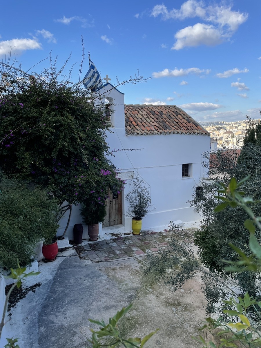 From the Holy Church of St. George of the Rock in the Anafiotika district in Athens, you would see the stunning view of Mount Lycabettus. On a clear day, you might be able to see Mount Parnitha, which is a mountain range located northwest of Athens, and Mount Olympus, which is located in northern Greece and is the highest mountain in Greece. Mount Lycabettus is a truly breathtaking sight and a must-see for anyone visiting Athens.