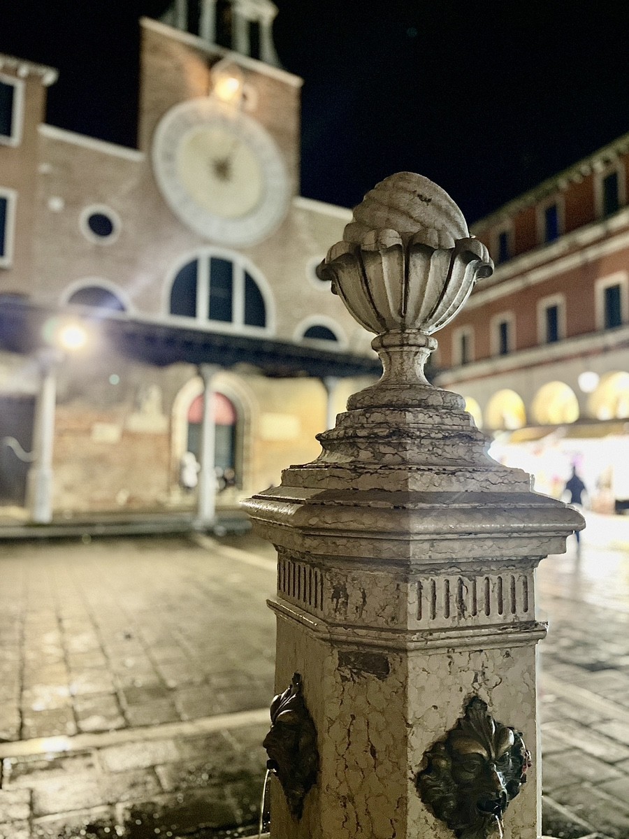 Фонтан на Campo San Giacomo di Rialto, — это не просто украшение, а памятник венецианской инженерной мысли. В отличие от Рима, где вода веками текла по античным акведукам, в Венеции никогда не было естественных источников пресной воды. До конца XIX века фонтанов с текущей водой не существовало. Горожане использовали колодцы-цистерны. Это были сложные подземные фильтры: дождевая вода стекала через решетки, проходила через слои песка и скапливалась в центре. Тот фонтан, что вы видите сейчас, появился после 1884 года, когда в город проложили подводный водопровод с материка. Украшение на вершине фонтана — это кедровая шишка (pigna). В итальянской культуре это древний символ плодородия, регенерации и жизненной силы. Шишка часто венчает фонтаны, так как она символизирует «источник жизни» и чистоту. Церковь Сан-Джакомо-ди-Риальто, на которую смотрит фонтан, — легендарное место. Согласно преданию, она была заложена 25 марта 421 года — в день основания самой Венеции. Хотя историки спорят о точной дате, она официально считается старейшей в городе. Обратите внимание на огромные часы на фасаде. У них необычный циферблат на 24 часа, и они были жизненно важны для купцов Риальто, чтобы точно фиксировать время сделок. На апсиде церкви со стороны рынка высечена латинская надпись, призывающая торговцев быть честными, не обвешивать и не лгать. Эта надпись — настоящий «кодекс чести» средневекового капитализма. Она была высечена в XII веке специально для того, чтобы каждый купец, заключающий сделку на рынке, видел её перед глазами. На латыни она звучит так: «Hoc circa templum sit jus fasque maratorum, curato statera, punda justa, ne tua lucra dolo» В переводе это означает примерно следующее: «Вокруг этого храма закон купцов да будет праведным...» «...да будут весы их точными, а гири верными...» «...и да не будет в прибыли твоей обмана!» Почему это важно? Бог как гарант сделки: В те времена религия и бизнес были неразрывны. Купцы верили, что если они обманут покупателя прямо под стенами церкви и под этой надписью, то их ждет не только земной суд, но и божья кара. Церковь Сан-Джакомо буквально «освящала» рынок, делая его зоной доверия. Фраза про «точные весы» — это не просто метафора. На площади Риальто действительно стояли официальные городские весы, по которым проверяли честность сделок. Если весы купца не совпадали с государственными, его ждало суровое наказание (вспомните того самого Горбуна, которого мы обсуждали!). Венеция жила торговлей. Если бы на Риальто начали массово обманывать, купцы из других стран перестали бы сюда приплывать. Поэтому честность была вопросом выживания всей Республики.