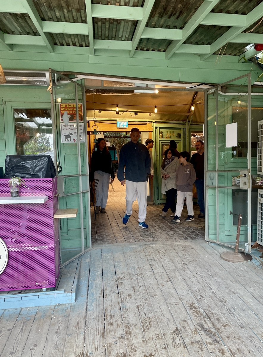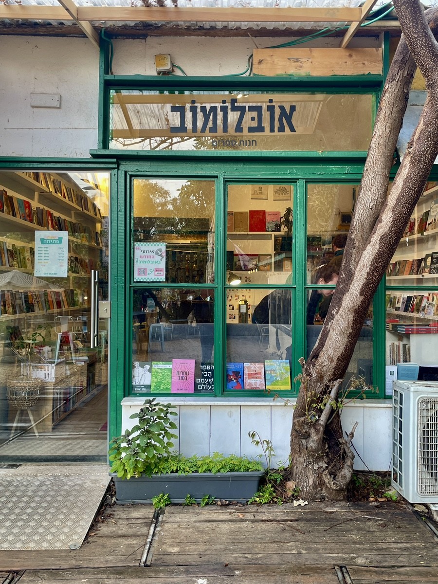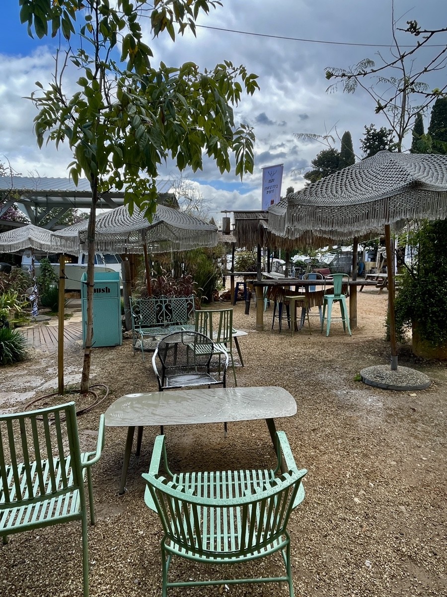 Плетеные зонты и разномастные стулья создают атмосферу временного, «кочевого» уюта. Книжный магазин «Обломов», встроенный в один из бывших загонов, — это высшая точка трансформации. Там, где когда-то был загон, теперь стоят стеллажи с литературой. Название магазина отсылает к русской классике и философии осознанного безделья, что идеально резонирует с нынешним неспешным ритмом «Урвот». Это место больше не про работу в поле, а про работу мысли и рук. Стеклянные витрины с книгами на фоне старой побелки и кондиционеров показывают, как современный израильский быт обживает старые стены, превращая бывшую промзону в уютную интеллектуальную гостиную под открытым небом.