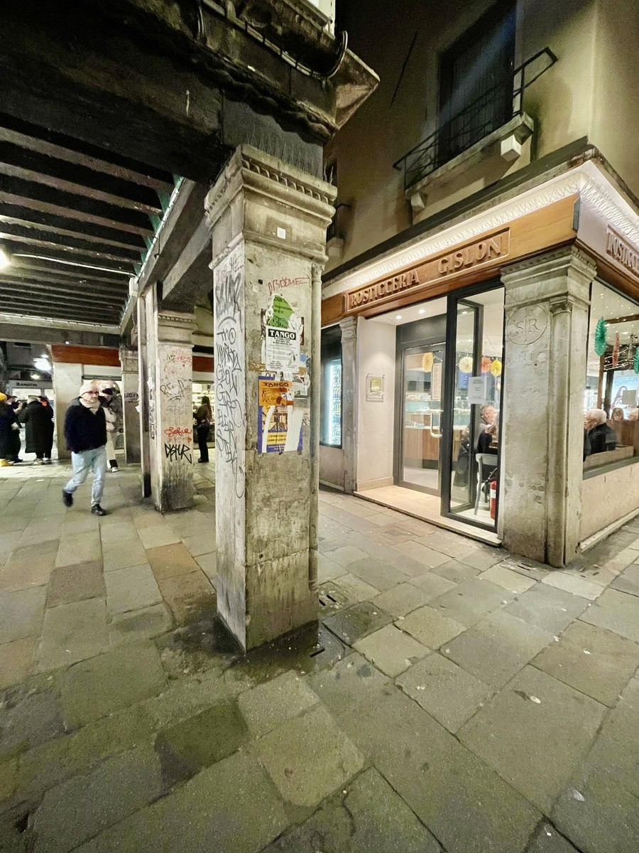 Мы движемся вдоль Гранд-канала к рыбному рынку Риальто (Pescaria). Зимой, в свете фонарей, его неоготические арки кажутся декорациями к таинственной пьесе. Это чрево Венеции, где веками шумят торговцы и где «язык камня» встречается с повседневной суетой. Пройдя через легендарный мост Риальто, мы попадаем в самое сердце коммерции, где банковские палаццо соседствуют с крошечными лавками.