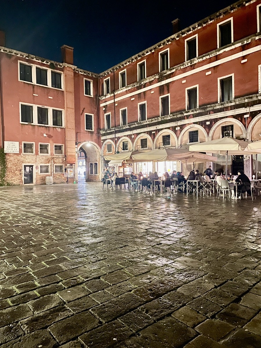 На Кампо Сан-Сальвадор мы замечаем шрам истории — австрийское пушечное ядро, застрявшее в стене церкви, — и любуемся кованым драконом, охраняющим старинную лавку зонтиков. Это город деталей, где точность важнее масштаба.