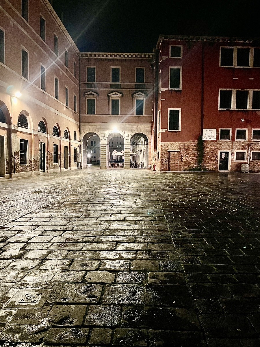 Мы движемся вдоль Гранд-канала к рыбному рынку Риальто (Pescaria). Зимой, в свете фонарей, его неоготические арки кажутся декорациями к таинственной пьесе. Это чрево Венеции, где веками шумят торговцы и где «язык камня» встречается с повседневной суетой. Пройдя через легендарный мост Риальто, мы попадаем в самое сердце коммерции, где банковские палаццо соседствуют с крошечными лавками.