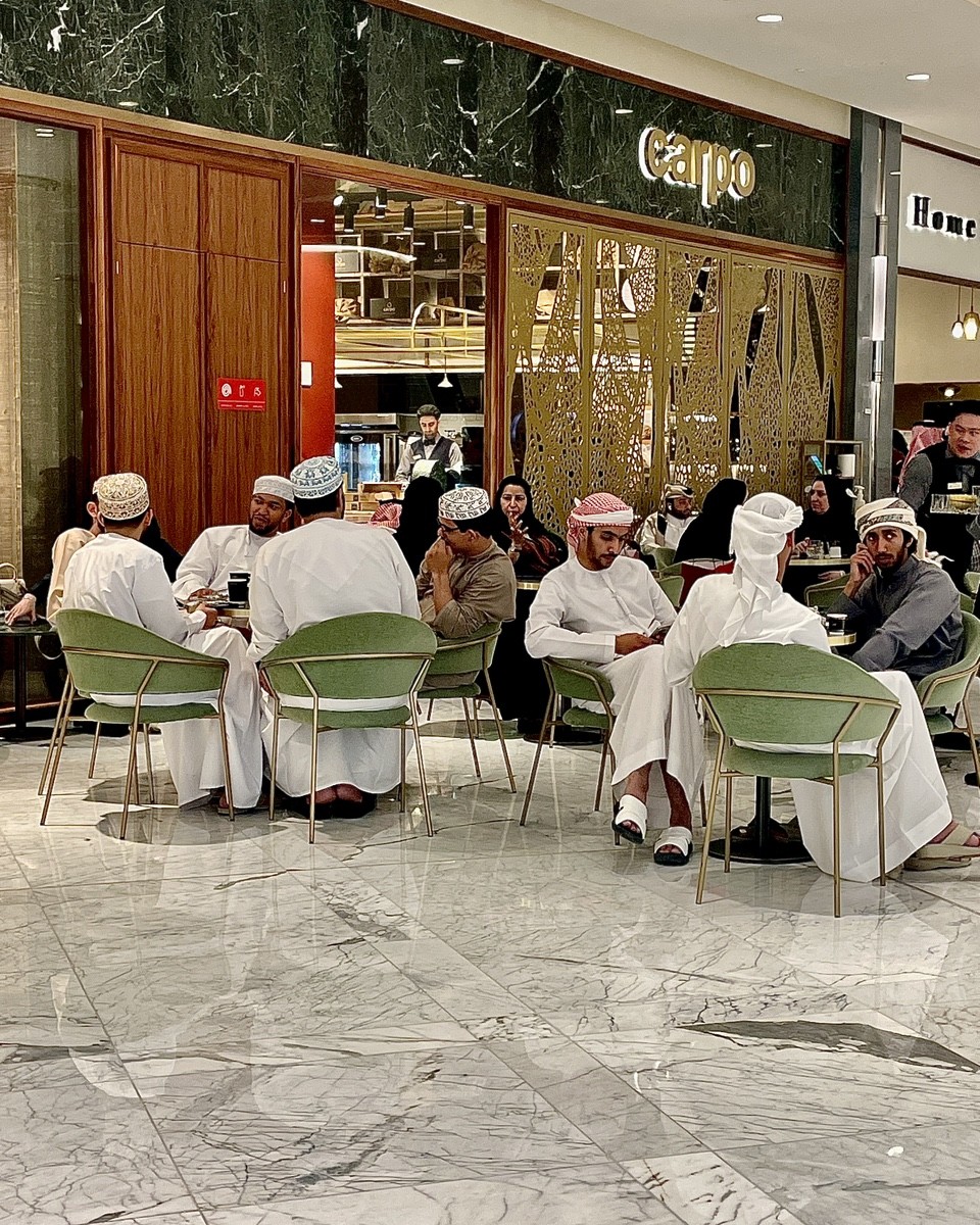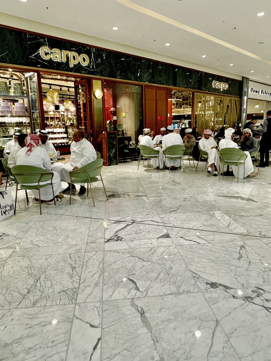 Интересно наблюдать за публикой. За столами часто сидят местные мужчины в кандурах, семьи, пожилые пары, люди, которые явно пришли не «в молл», а именно сюда. Это редкий случай, когда европейский формат не вытесняет локальную культуру, а аккуратно в неё встраивается. Carpo работает как нейтральная территория — не арабская и не туристическая, а удобная для всех.