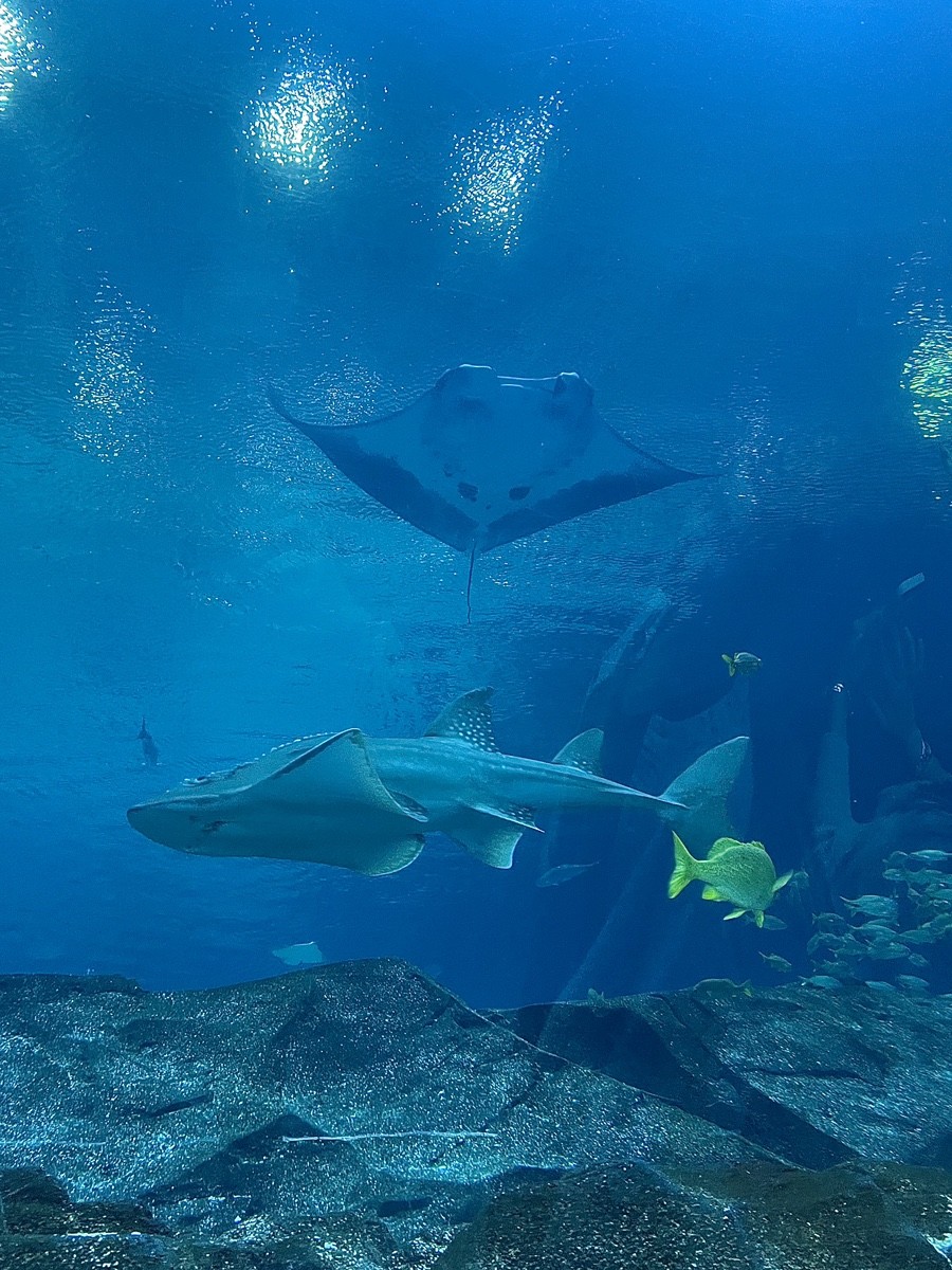 Walking through the transparent tunnel beneath the water, visitors find themselves surrounded: mantas soar overhead, tuna dart past, and a whale shark glides slowly by. For a moment, it feels as though you’ve stepped inside the ocean itself.
