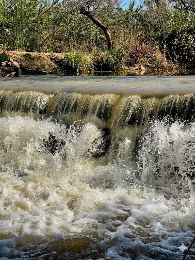 Этот порог, созданный человеком, чтобы можно было пересечь реку, когда ее поток спокоен, превратился в настоящий «Тайный водопад». Высокие заросли тростника и склонившиеся над водой вековые эвкалипты прячут это место от посторонних глаз, создавая атмосферу почти мистического убежища в самом сердце оживленного округа Шарон.