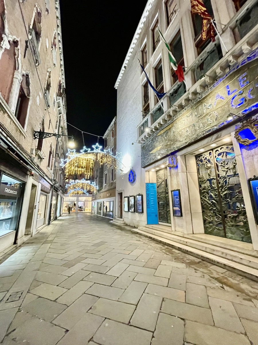 Путь ведет нас к площади Сан-Марко, которая в сезон фестиваля превращается в мистический театр. Но мы уходим от толпы вглубь, к району Сан-Лука. Здесь, у театра Гольдони и здания H&M (Palazzo Nervi-Scattolin), мы ловим тот самый контраст, который так ценил Гёте: ренессансная резьба акантом на фасадах встречается с модернизмом XX века. Мы идем по следам «немецкого купца Мёллера» (инкогнито великого поэта) через Калле дель Лово — «Волчью улицу», где в створе домов вдруг вспыхивает шпиль колокольни.