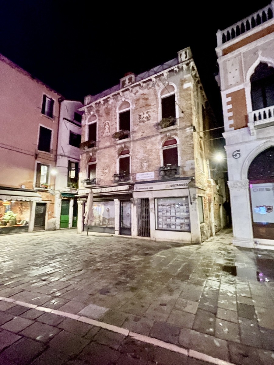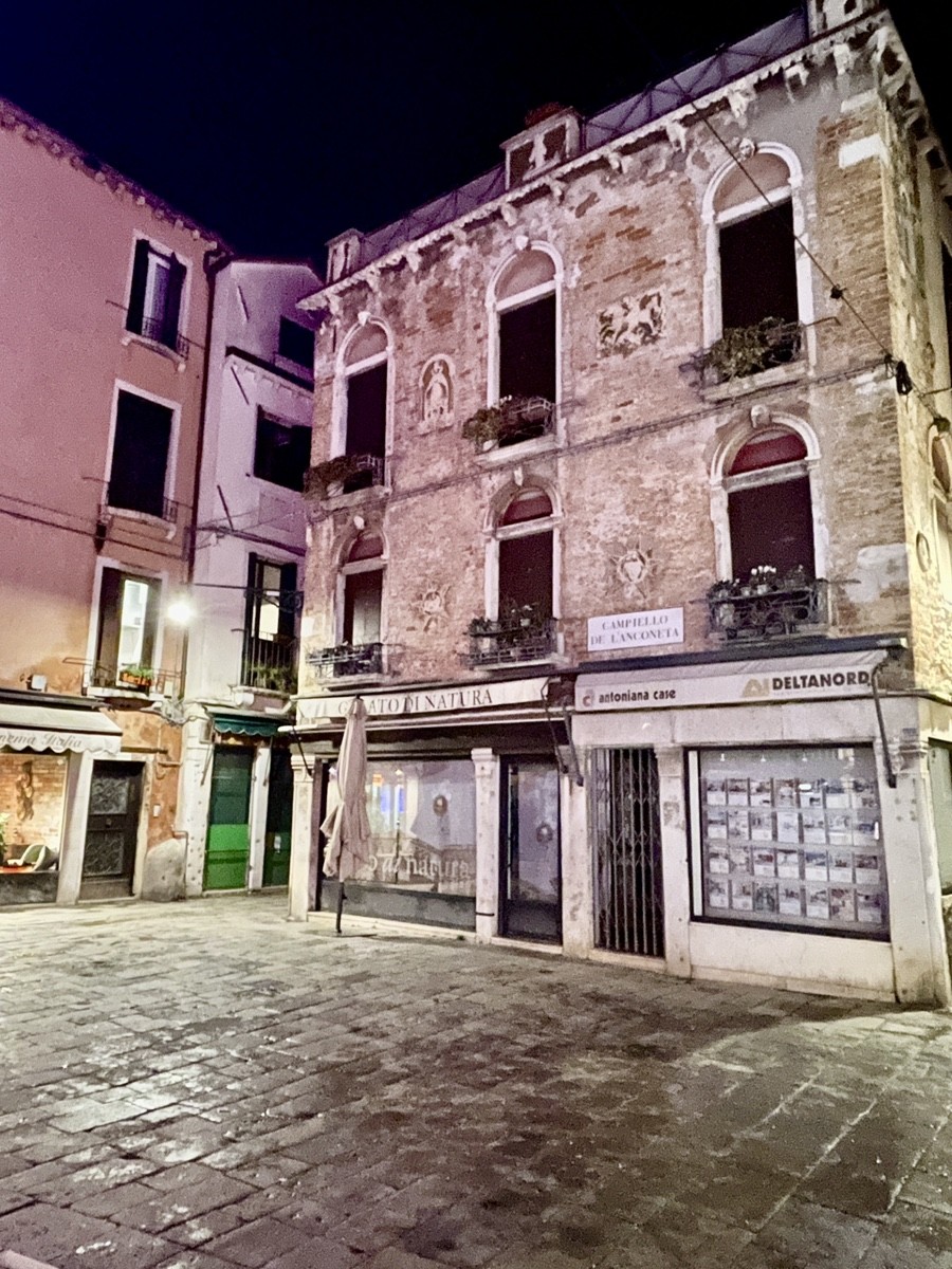 Этот дом «говорит» о сопротивлении времени. Пока вокруг него сносили стены ради Страда Нова и строили огромные кинотеатры-театры (как «Италия»), он сохранил свою камерность. Облупившаяся штукатурка обнажает старый кирпич — «мясо» города, которое венецианцы всегда считали более честным, чем нарядную отделку.