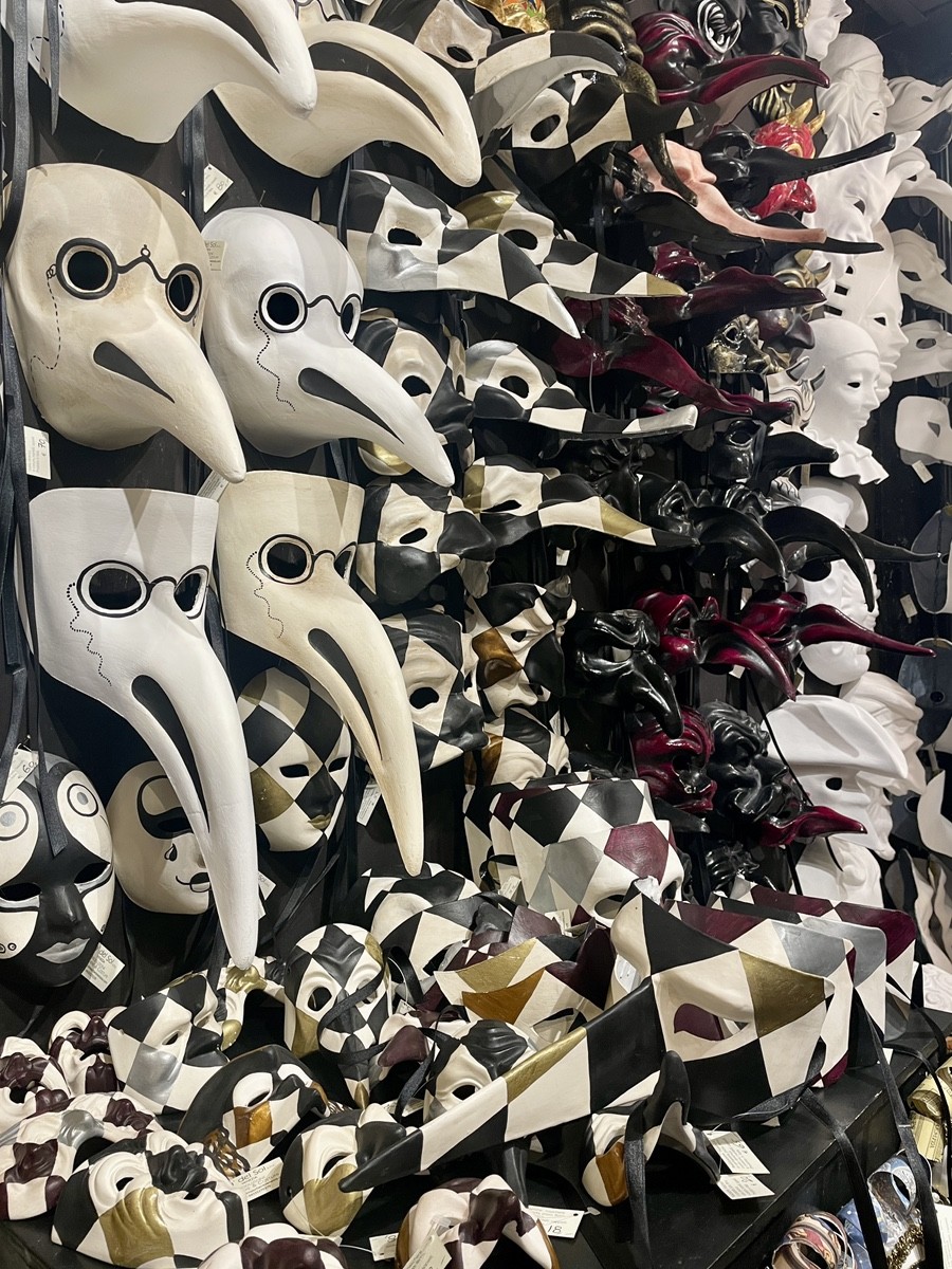 Мастерская живет этим «высоким обманом» и сегодня. Их главные клиенты — это мировая элита, покупающая полные костюмы из тяжелого венецианского бархата и золотой парчи за десятки тысяч евро. Это плата за вход в миф. И в этой мастерской золото тщеславия всегда соседствует с клювом Врача Чумы (Il Medico della Peste). Этот длинный нос — не фантазия художника, а газовый фильтр XVIII века. В него набивали чеснок и губки с уксусом, чтобы врач мог дышать среди трупов. В районе Кармини это соседство было буквальным: за стеной казино, где пили дорогое вино, всегда могла затаиться тень очередной эпидемии.