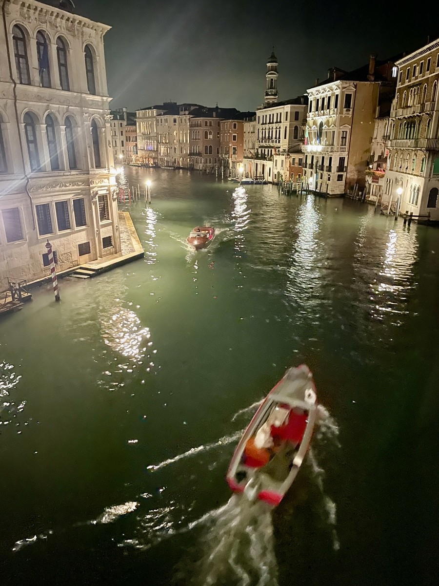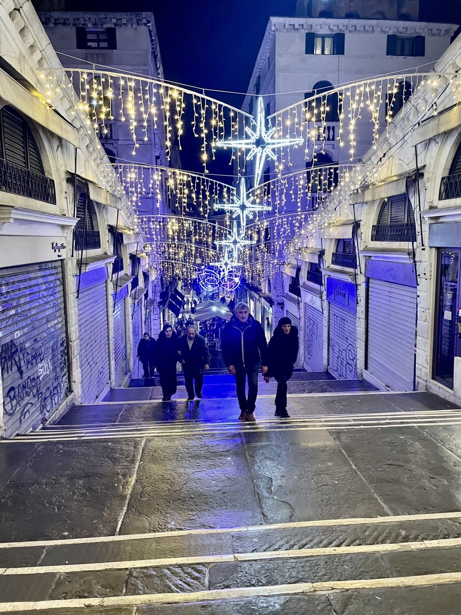 Мы движемся вдоль Гранд-канала к рыбному рынку Риальто (Pescaria). Зимой, в свете фонарей, его неоготические арки кажутся декорациями к таинственной пьесе. Это чрево Венеции, где веками шумят торговцы и где «язык камня» встречается с повседневной суетой. Пройдя через легендарный мост Риальто, мы попадаем в самое сердце коммерции, где банковские палаццо соседствуют с крошечными лавками.