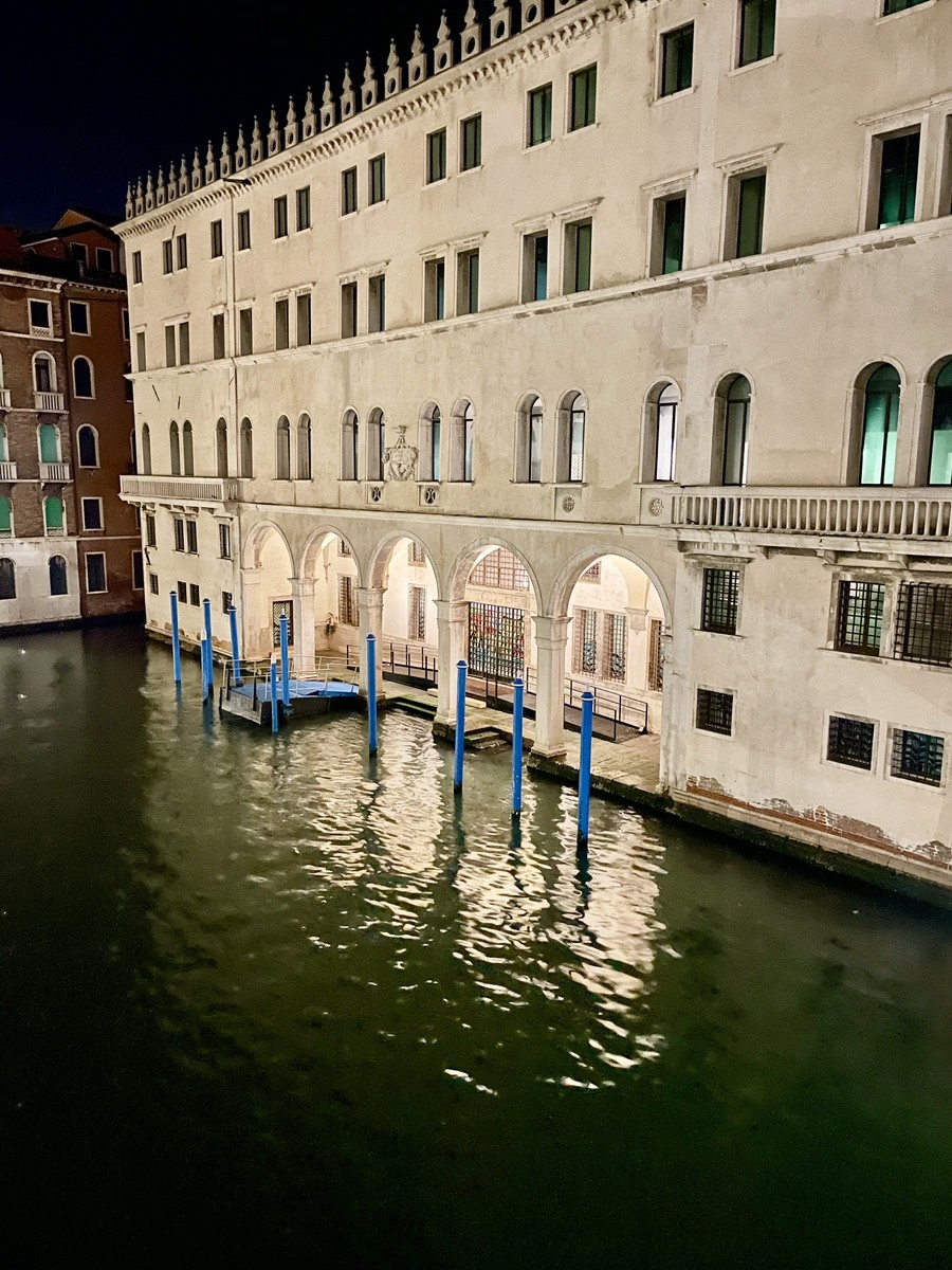 Этот район венецианцы называют Rialto di Qua (эта сторона Риальто) — место, где роскошь палаццо встречается с суетой торговых переулков. Массивное здание с ровными рядами окон это Фондако-деи-Тедески (Fondaco dei Tedeschi) Это было «немецкое подворье». В XVI веке его фасад был полностью расписан фресками Тициана и Джорджоне. К сожалению, морской воздух и влага их уничтожили, но масштаб здания до сих пор говорит о невероятном богатстве немецких купцов в Венеции. За ним тянется Riva del Ferro (Железная набережная) Она называется «Железной», потому что когда-то здесь разгружали железо и металлы. Большое белое здание (на фото оно заметно своей классической архитектурой), это Палаццо Дольфин-Манин, его сейчас занимает Банк Италии. Это был дом последнего дожа Венеции, Людовико Манина. Над волой очень красиво играют на свету желтые маркизы (навесы) отелей и кафе. Тут же видны палины (paline) — те самые разноцветные полосатые столбы, к которым привязывают гондолы. Раньше цвета столбов указывали на то, какому знатному семейству принадлежит палаццо напротив.