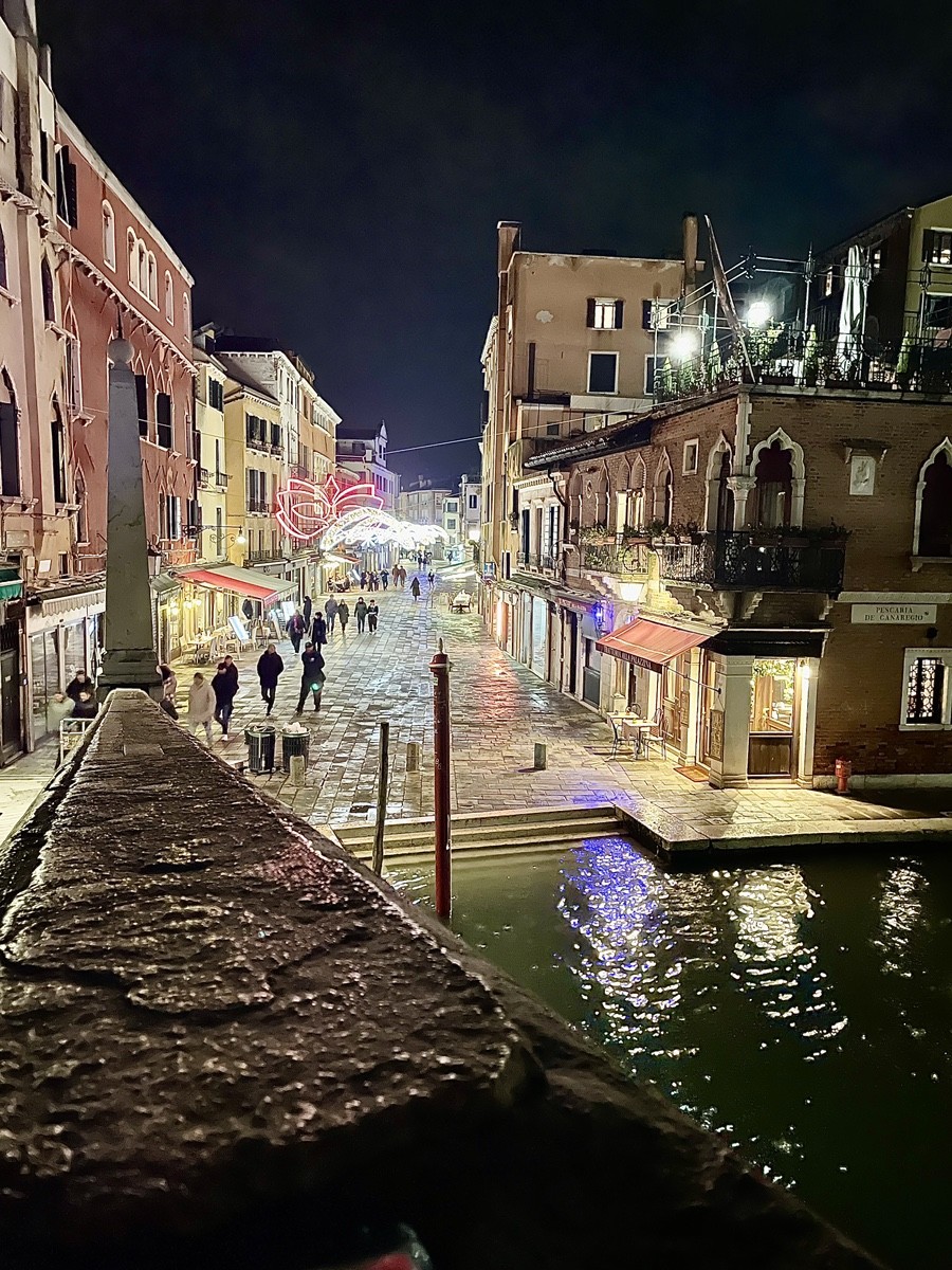 Стоя на его высшей точке, мы видим Канал Каннареджо — вторую по значимости водную магистраль Венеции. Это был «парадный подъезд» Республики: именно здесь проходили корабли послов и тяжелые торговые барки, прибывавшие с материка. Здесь «застывшая музыка» Гёте меняет свою тональность с камерной на торжественную, обретая почти военный, имперский ритм.