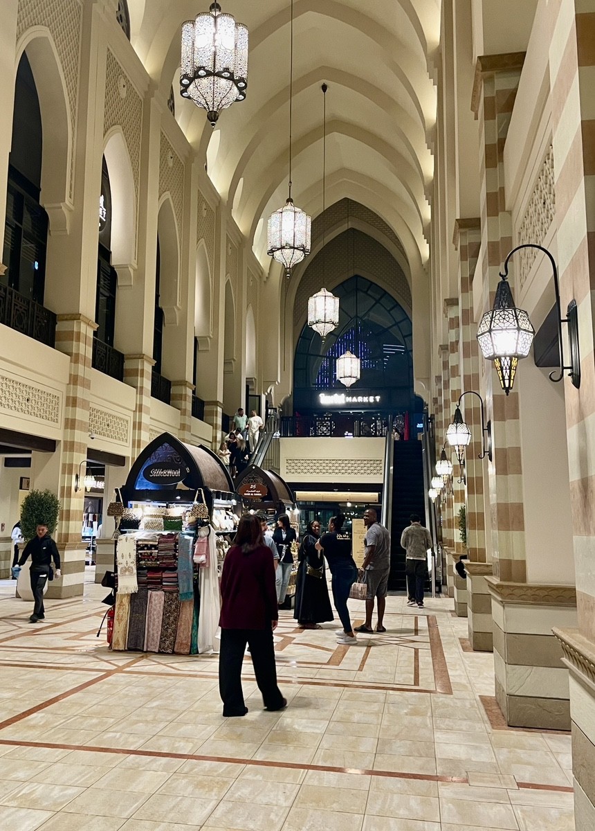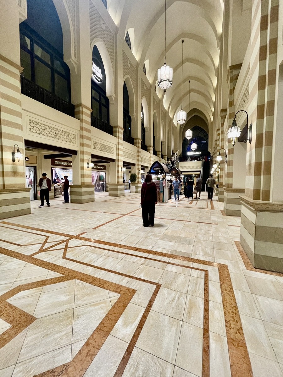 Архитектура комплекса сознательно использует элементы, характерные для традиционного строительства региона: аркады, сводчатые потолки, чередование светлого и тёплого камня, геометрический рисунок пола. Это не копия старого города и не реконструкция утраченного сука, а современное здание, стилизованное под «историческую» ткань для создания контраста с Dubai Mall и небоскрёбами вокруг.