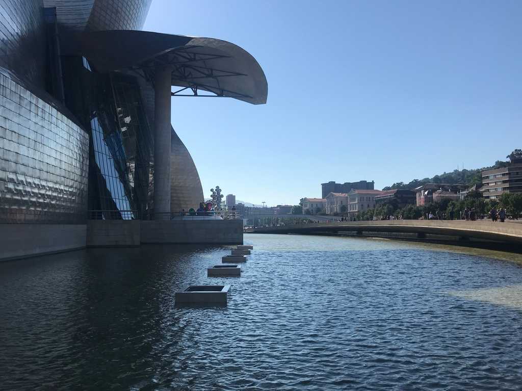 Южная сторона музея Гуггенхайма словно растворяется в реке Нервьон. Титановые пластины его фасада изгибаются, как волны, и повторяют русло воды, будто сам город, бывший когда-то верфью, снова вспомнил о своей морской душе. Архитектор Фрэнк Гери задумал музей как корабль, плывущий по реке — не только по воде, но и по времени. Его формы не подчиняются симметрии: металл, стекло и свет соединяются в живое дыхание города, где прошлое судостроителей стало искусством будущего.