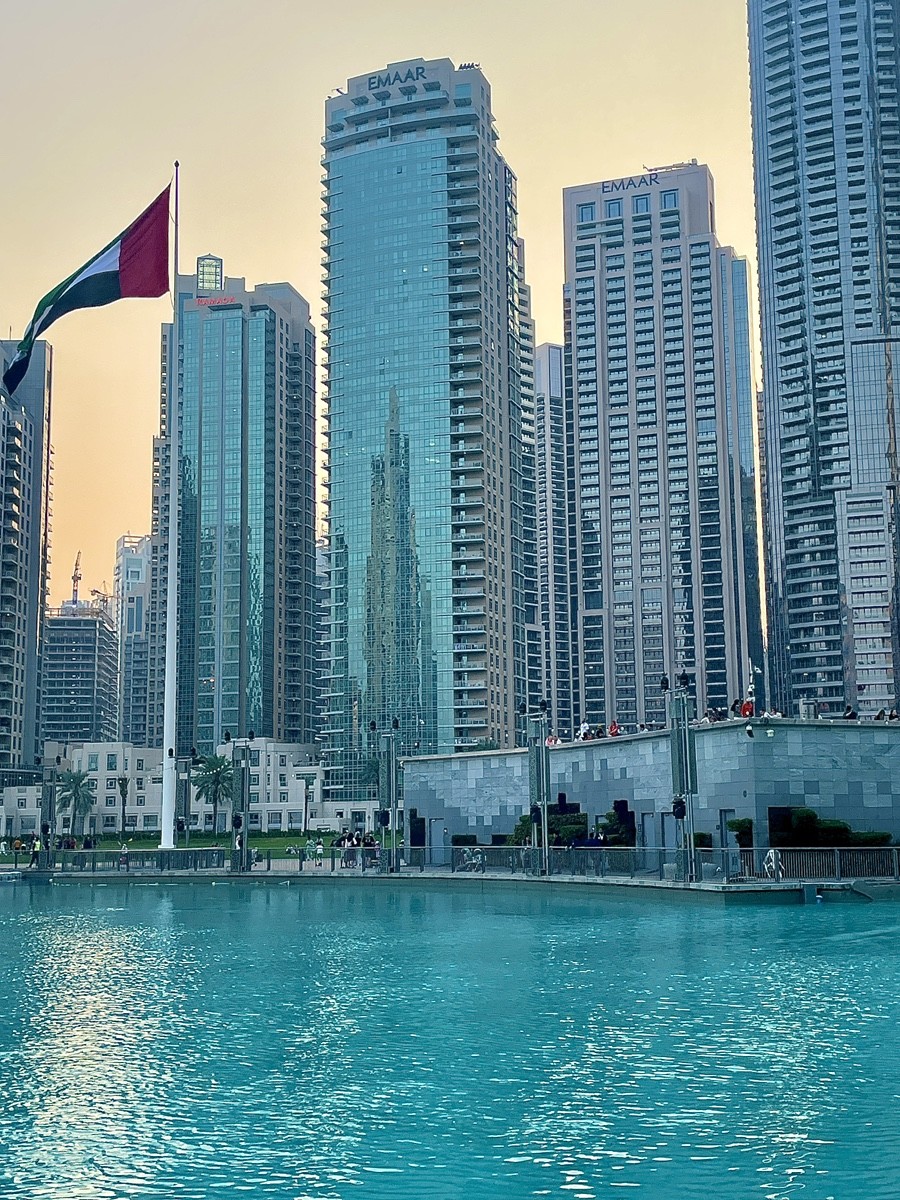 Это место читается не как набережная и не как видовая точка, а как линия баланса между покоем и рекордом. Вода здесь работает зеркалом, которое на мгновение уравновешивает вертикальный напор башен: небоскрёбы отражаются, теряют вес и становятся частью спокойной плоскости. Флаг на фоне воды — не акцент и не декор, а маркер присутствия государства в пространстве глобальной архитектуры, где формы и масштабы легко могли бы стать анонимными.