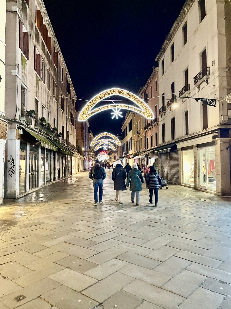 Мы движемся вдоль Гранд-канала к рыбному рынку Риальто (Pescaria). Зимой, в свете фонарей, его неоготические арки кажутся декорациями к таинственной пьесе. Это чрево Венеции, где веками шумят торговцы и где «язык камня» встречается с повседневной суетой. Пройдя через легендарный мост Риальто, мы попадаем в самое сердце коммерции, где банковские палаццо соседствуют с крошечными лавками.