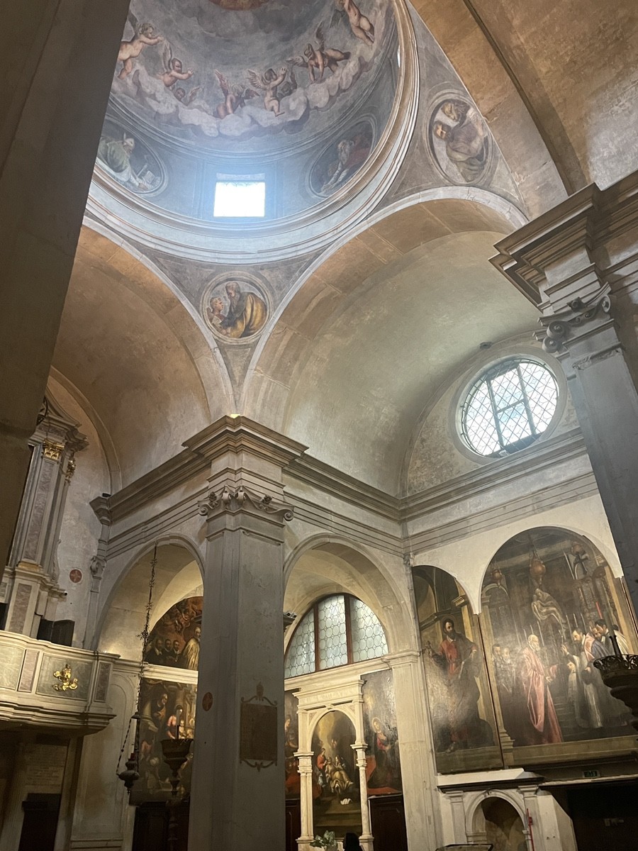 Интерьер церкви Сан-Джованни Элемозинарио подтверждает репутацию этого места как сокровищницы венецианской живописи. После пожара 1514 года её восстановили в строгом и гармоничном стиле греческого креста. В треугольных изгибах под куполом вы видите круглые медальоны. Это изображения четырех евангелистов. Эти фрески принадлежат кисти Порденоне (Джованни Антонио де Сакки). Он был главным конкурентом Тициана, и его стиль здесь отличается динамикой и почти «трехмерными» ракурсами фигур. Картина над алтарем: Вы видите полотно Тициана «Святой Иоанн Милостивый» (ок. 1533 г.). На ней святой изображен в момент совершения того самого дела, за которое получил свое прозвище — он подает милостыню бедняку. Обратите внимание на композицию — святой одет в роскошное красное облачение, что подчеркивает его статус патриарха, но его жест направлен вниз, к человеку, нуждающемуся в помощи. Это символ смирения. Характерная венецианская плитка «в шашечку» из красного и белого мрамора, типичная для ренессансных интерьеров города.