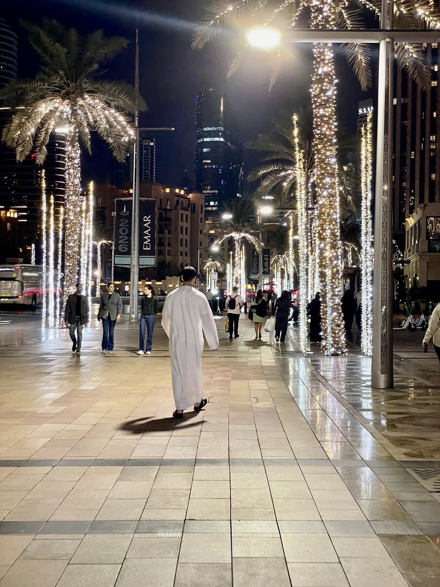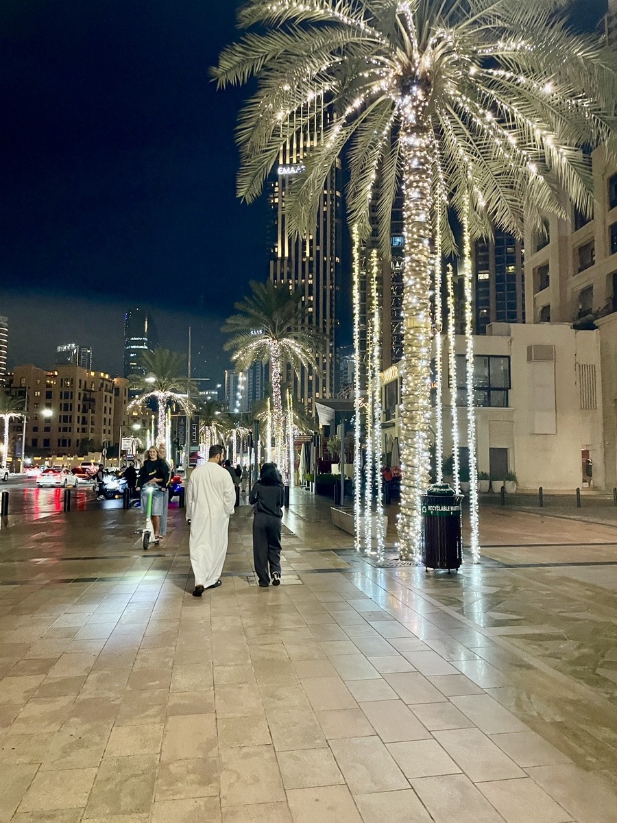 Бульвар устроен как редкий для Дубая гибрид. С одной стороны — это инфраструктура: широкие тротуары, пальмы, свет, безопасность, автомобильное движение по краю. С другой — это социальное пространство, где власть не демонстрируется архитектурой рекордов, а растворяется в нормальной городской жизни. Здесь идут семьи, местные жители, офисные сотрудники, туристы, и никто не чувствует себя гостем или лишним.