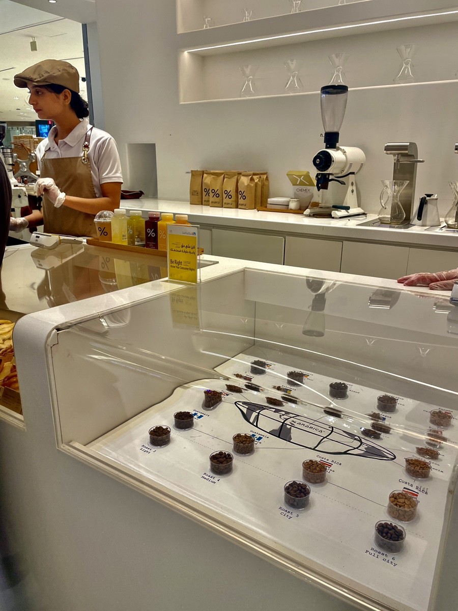% Arabica в Dubai Mall выглядит не как кофейня, а как лаборатория вкуса. Белое пространство, стекло, чёткая геометрия, открытая барная стойка и никаких лишних деталей. Здесь сразу понятно: внимание сосредоточено не на интерьере и не на атмосфере «посидеть», а на самом процессе приготовления кофе.