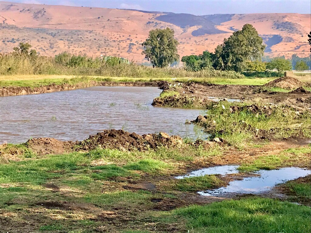 К востоку от озера Хула поднимаются Голанские высоты. В этом месте можно видеть, как избытки воды уходят в каналы, которые составляют русло реки Иордан.