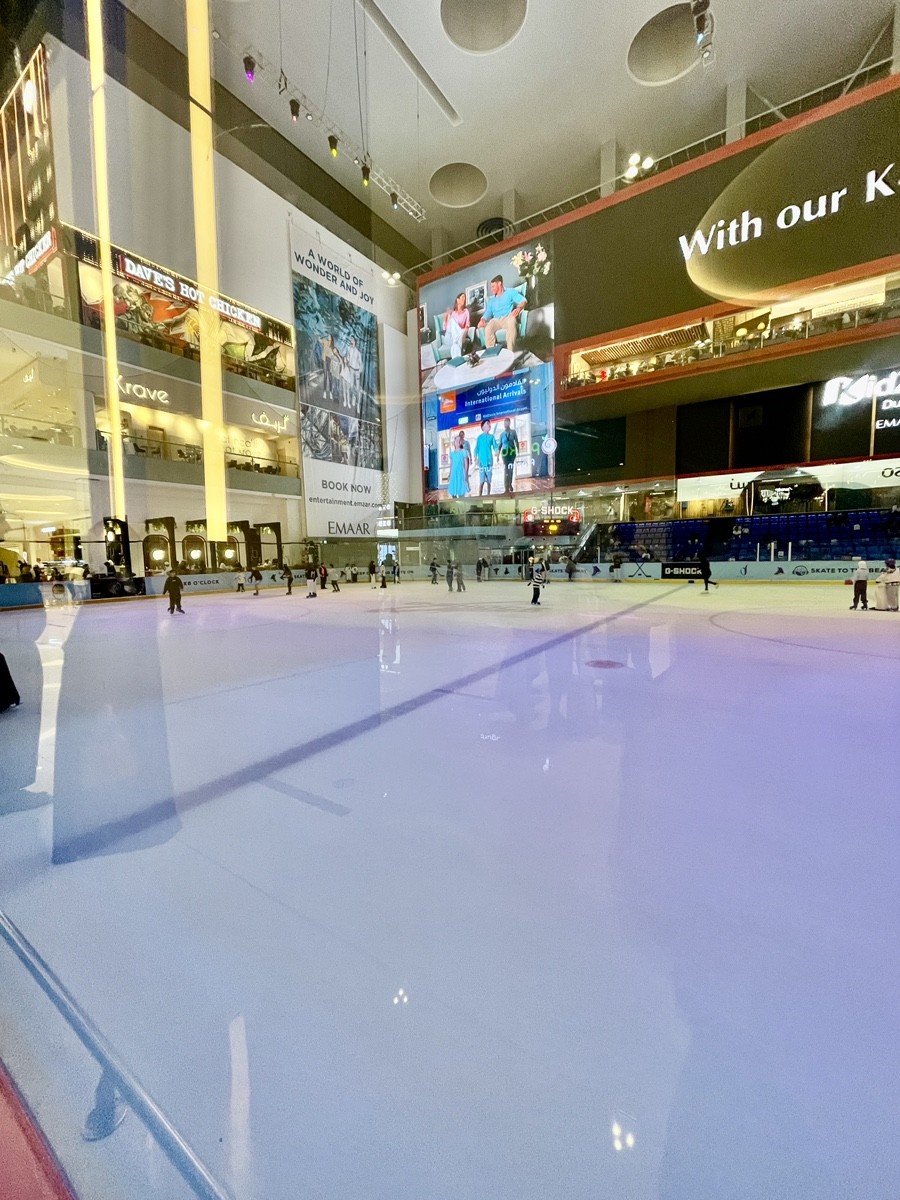 Dubai Ice Rink — одно из самых парадоксальных мест в Dubai Mall. В самом центре города, где большую часть года жара не отступает даже ночью, открывается полноценная ледовая арена олимпийского формата. Холод здесь не маскируется и не смягчается: ты выходишь с тёплого атриума прямо на лёд, и контраст ощущается телом сразу.