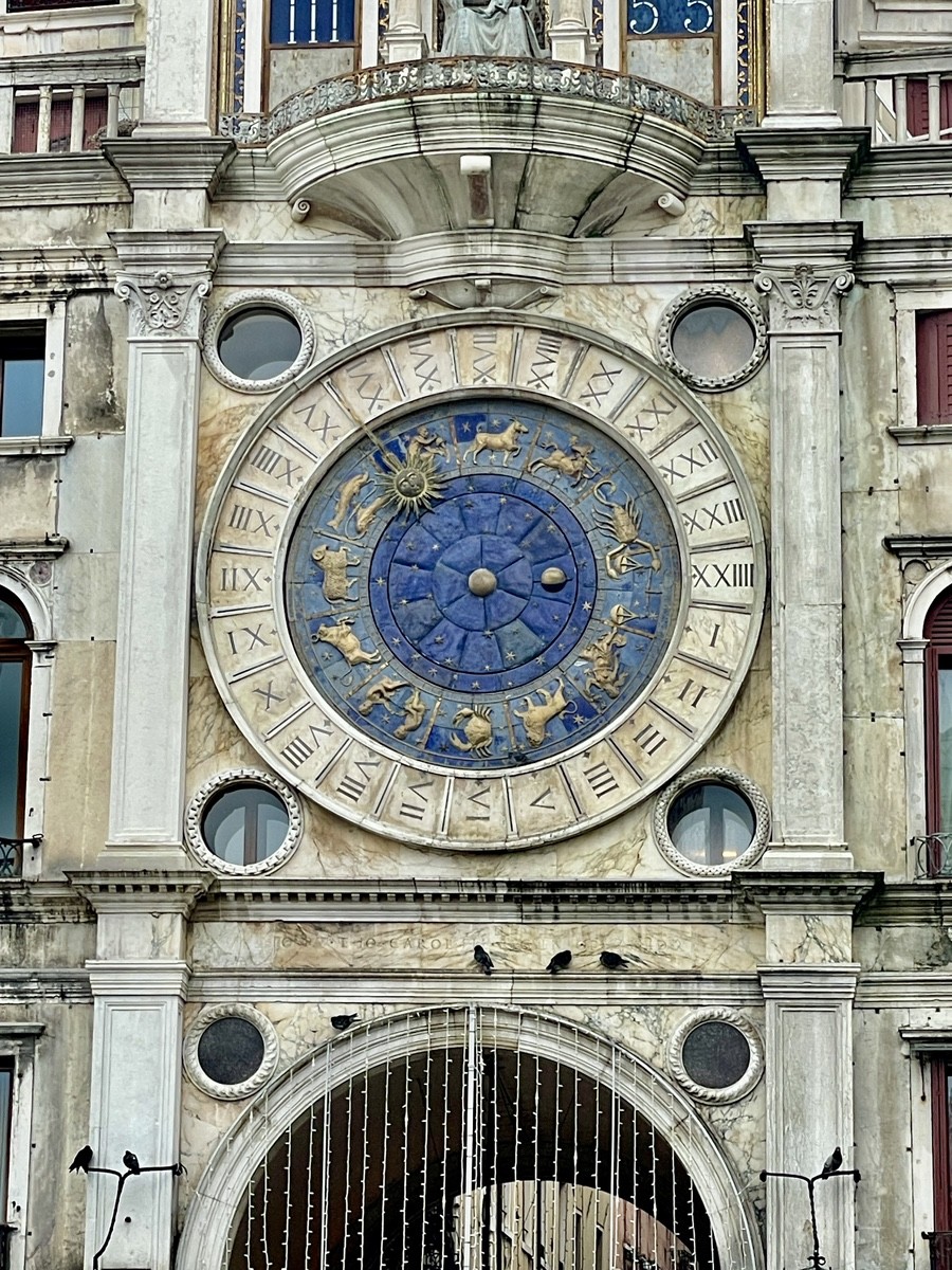 Центральный астрономический циферблат в золоте и лазури — это сложнейшая машина. Лазурный фон из эмали удерживает зодиакальный круг, по которому движется Солнце, а в самом центре вращается шар, показывающий фазы Луны. Для города, чей фундамент стоит в воде, это имело критическое значение: от фаз Луны зависели приливы и безопасность судоходства. Чуть выше, в нише с Богоматерью расположен самый ранний момент «цифровой» истории. Окошки с римской цифрой часа и арабскими минутами (III:45 и III:55) — это один из первых в мире цифровых механизмов. Каждые пять минут огромные диски внутри башни с грохотом поворачиваются, обновляя время. Однако эти синие ниши хранят секрет: дважды в год, на Богоявление и на праздник Вознесения (Sensa), цифры исчезают, и окошки превращаются в порталы. Из левой двери выходит ангел с золотой трубой, за ним — три волхва, которые проходят по балкону и совершают торжественный механический поклон перед Мадонной, прежде чем скрыться в правой двери. Над ними, на фоне усыпанного звездами неба, замер крылатый лев Святого Марка. Его книга открыта на словах «Pax Tibi Marce...», что в венецианском коде означает: открытая книга - мир. А закрытая - война.