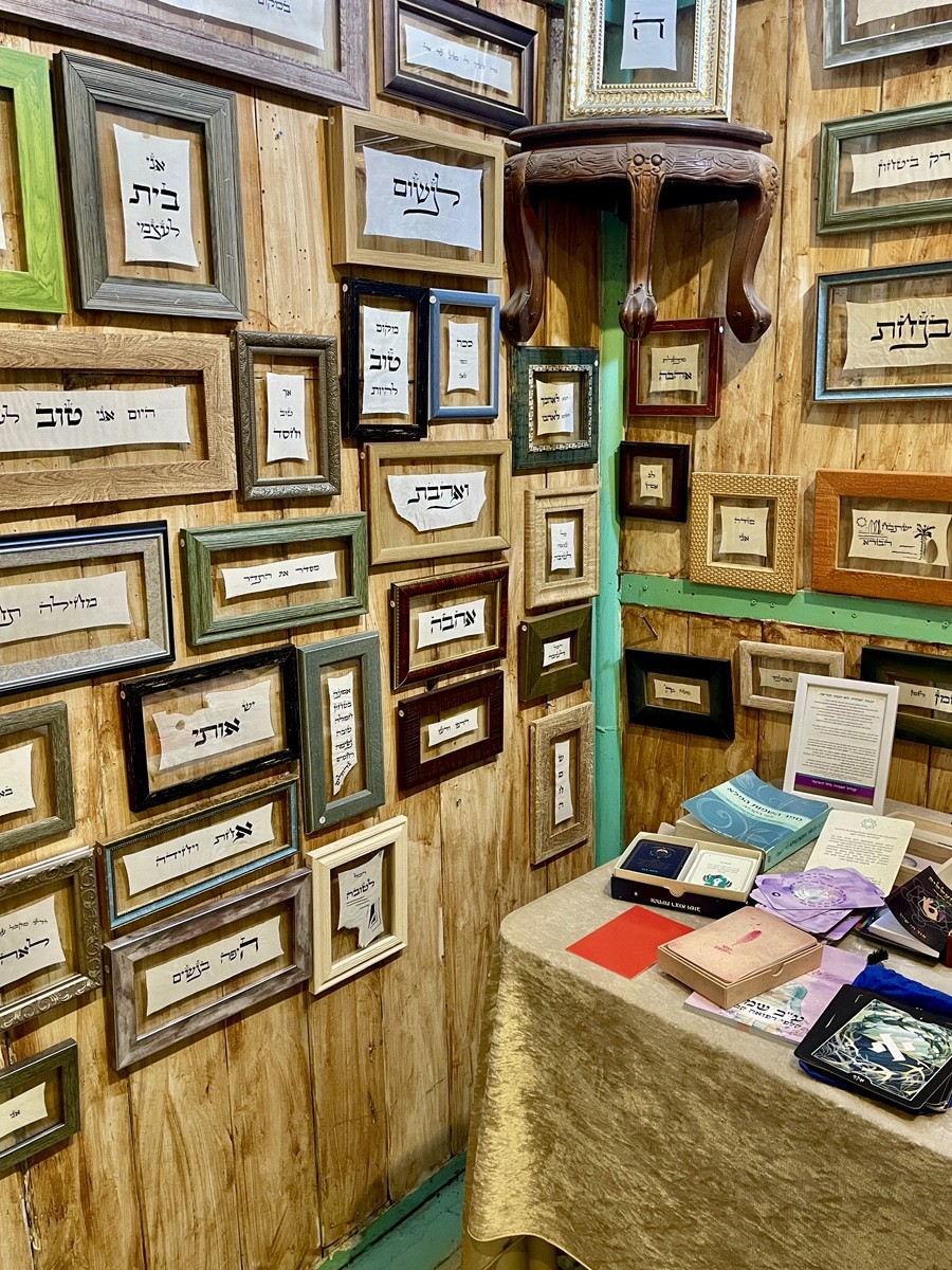 Забудьте о стерильных галереях и скучных сувенирных лавках. В «Конюшнях художников» в Пардес-Ханне есть уголок, где искусство встречается с глубокой духовностью, а еврейская каллиграфия обретает новую, современную жизнь. Это пространство, где стены говорят — в буквальном смысле. Здесь, среди грубых деревянных панелей, вы найдете сотни рамок. В каждой из них — не просто слова, а послания. Древние благословения, мудрые изречения на иврите, как «אהבה» (Любовь) или «תודה» (Спасибо), и абстрактные узоры из букв, выполненные с ювелирной точностью. Это место, где можно найти персональный талисман, подарок со смыслом или просто замереть перед картиной, чувствуя, как древние символы отзываются внутри. А рядом, на покрытых вельветом столах, лежат книги по саморазвитию, колоды таро и философские труды. Добавьте к этому очаровательную доску с детским рисунком мелом, и вы получите идеальный портрет этого места: искреннего, глубокого и невероятно живого. Это не просто магазин — это приглашение к диалогу с самим собой через красоту и слово.