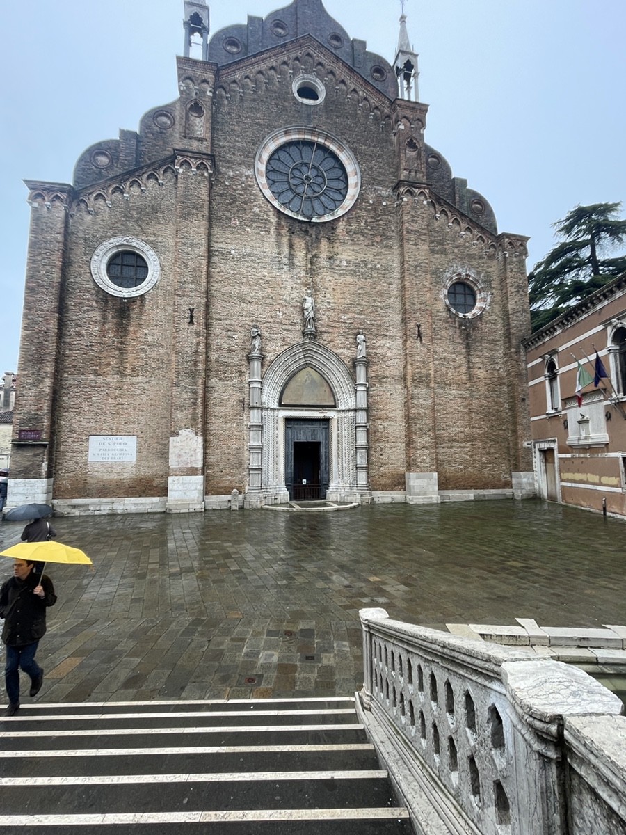 Путешествие начинается на мосту Сан-Стин. Сегодня он ведет на пустую площадь, но до 1810 года взгляд упирался в фасад церкви San Stefanino. Её снос по указу Наполеона превратил уютное кампо в «архитектурный черновик». Однако именно эта пустота позволяет острее почувствовать масштаб соседнего колосса — базилики Santa Maria Gloriosa dei Frari, которая стала для Венеции тем же, чем Пантеон для Рима.