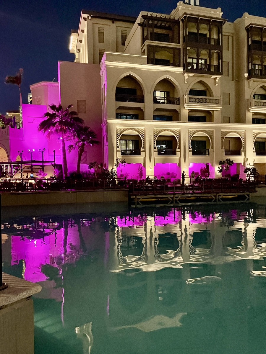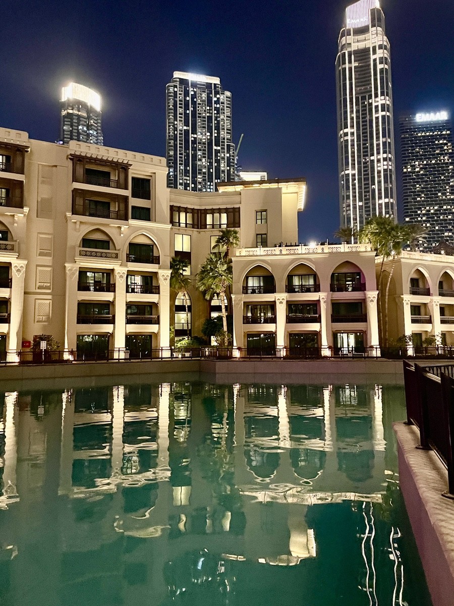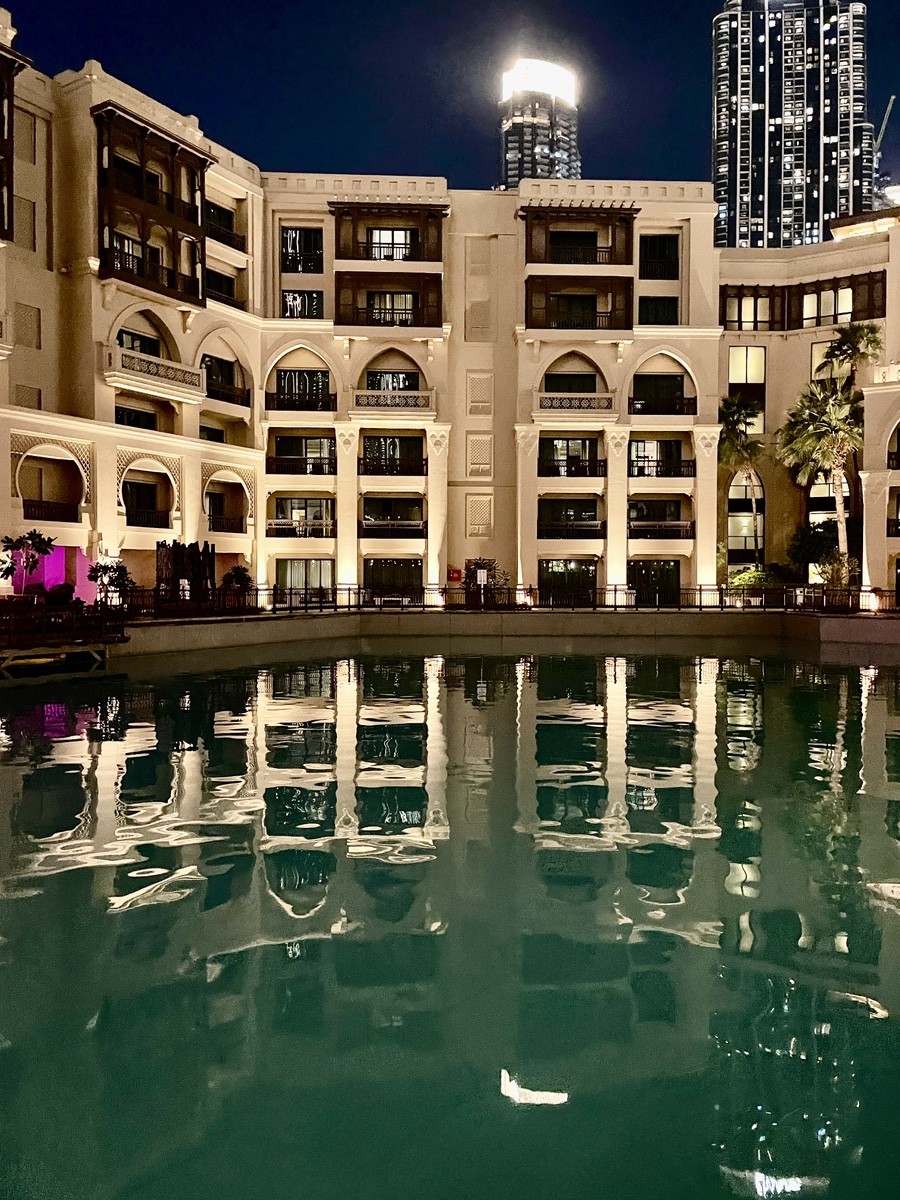Архитектура по краям водоёма намеренно занижена. Souk Al Bahar и прилегающие здания построены в масштабе, который не спорит с небоскрёбами, а принимает на себя роль переднего плана. Аркады, террасы, повторяющиеся пролёты создают ритм, который глаз считывает быстрее, чем высоту башен. Это сознательный приём: человек сначала видит близкое и понятное, и только потом — масштабное и недосягаемое.