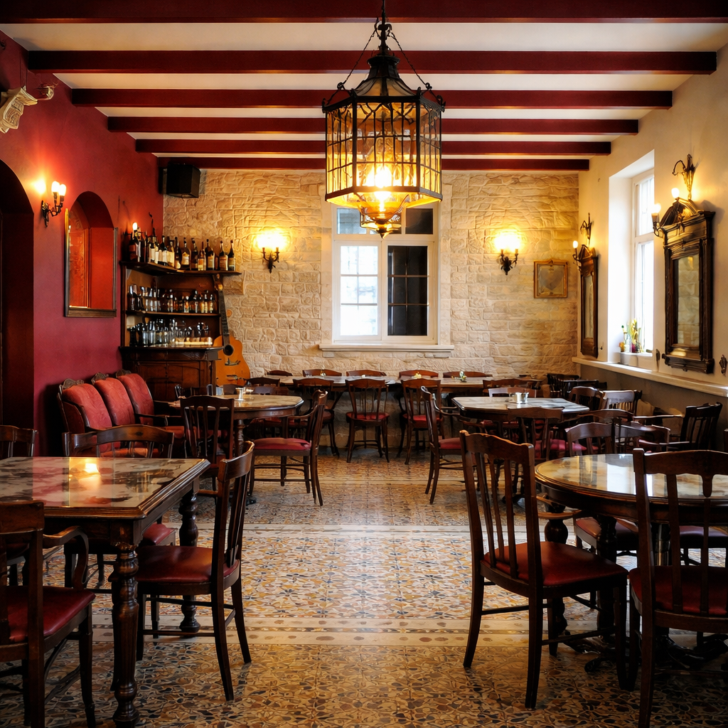 El menú del restaurante se basa en una combinación delicada de tradiciones del Oriente Próximo, del Mediterráneo y de la cocina francesa. Entre los platos emblemáticos están los rollatini, berenjenas doradas rellenas de queso de cabra con aceite de oliva y salsa de tomate; las costillas de cordero con romero como plato principal; y el postre de la casa, la pera al vino tinto con salsa de chocolate. Es una cocina entendida como un lenguaje propio: personal, honesto y profundamente haifense.