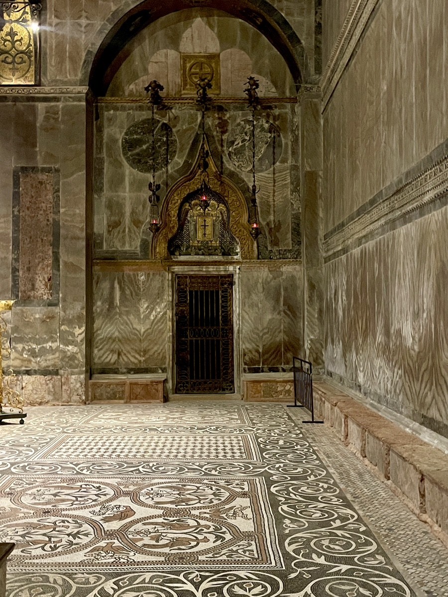 Мозаичный пол Баптистерия — это шедевр XII–XIII веков. На фото видны круги, в которые вписаны павлины и сказочные птицы. Павлин в христианской традиции — символ бессмертия. Ритмичный шахматный узор вокруг — это влияние Востока, эхо тех самых торговых путей, по которым в Венецию привозили не только специи, но и искусство. Над баптистерием виден изгиб арки с изображением Святой Катарины (SCA CATARINA). Золотой фон здесь кажется более густым и темным из-за вековой копоти свечей. Эти мозаики создавались в XIV веке при доже Андреа Дандоло — человеке исключительного ума и последнем правителе, похороненном в соборе. Святая Катарина Александрийская была покровительницей ученых и философов. Её присутствие в Баптистерии не случайно: Венеция всегда ценила интеллект.