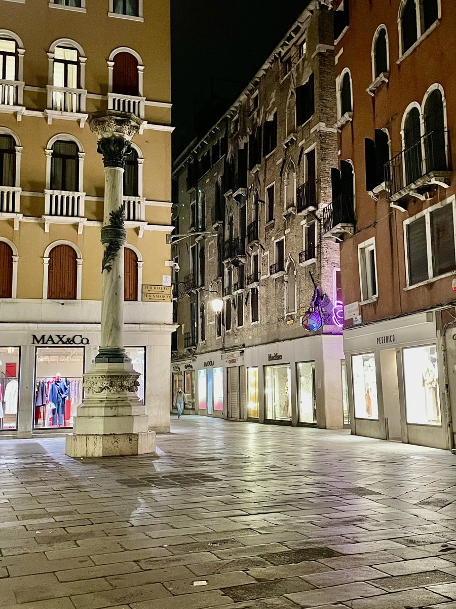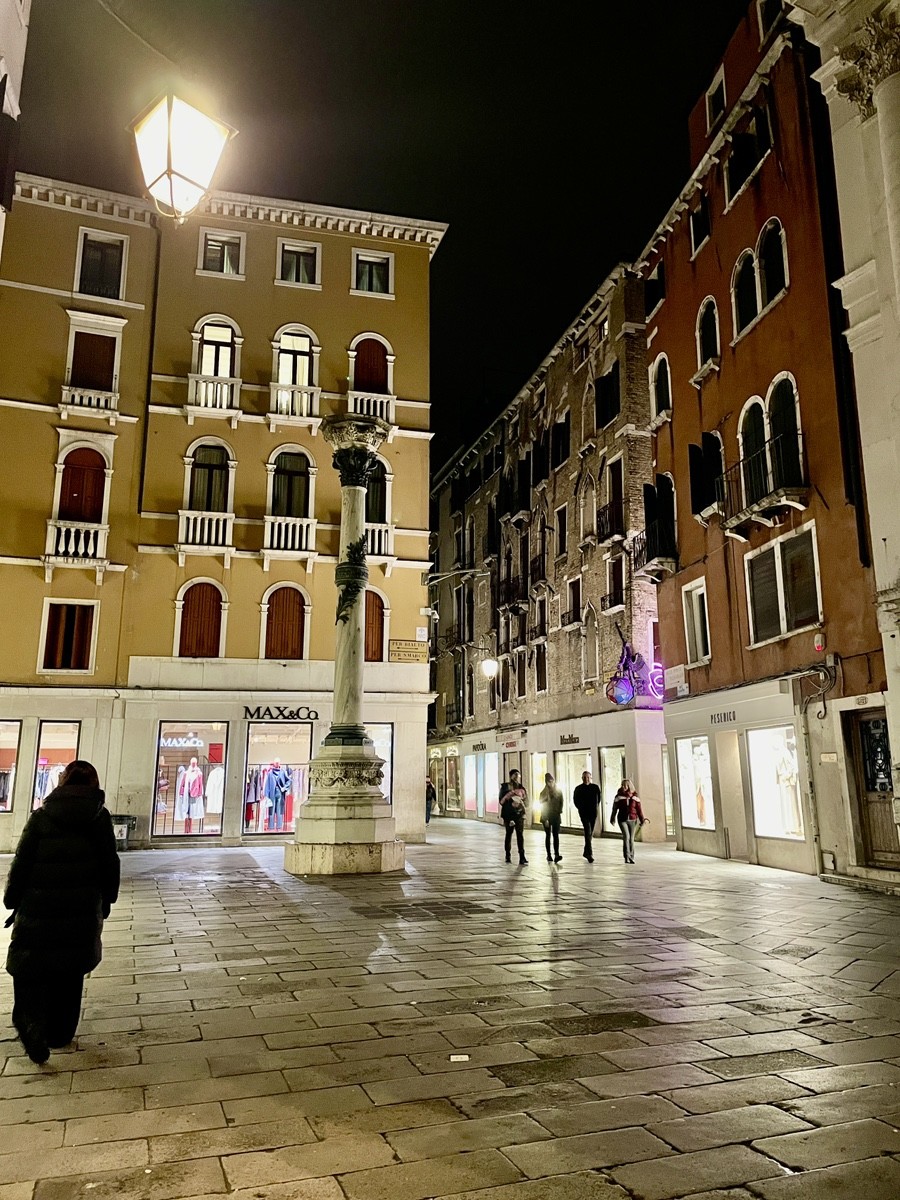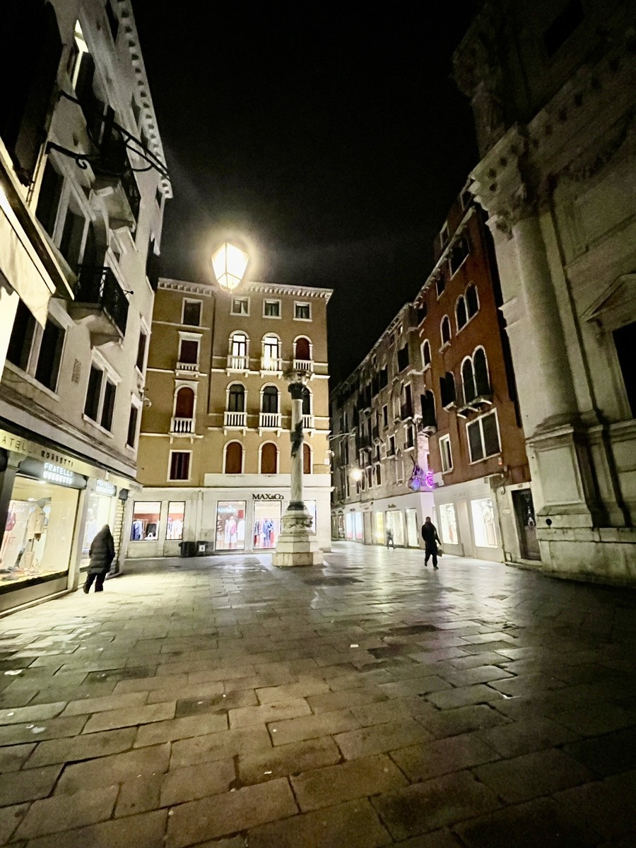Мы движемся вдоль Гранд-канала к рыбному рынку Риальто (Pescaria). Зимой, в свете фонарей, его неоготические арки кажутся декорациями к таинственной пьесе. Это чрево Венеции, где веками шумят торговцы и где «язык камня» встречается с повседневной суетой. Пройдя через легендарный мост Риальто, мы попадаем в самое сердце коммерции, где банковские палаццо соседствуют с крошечными лавками.