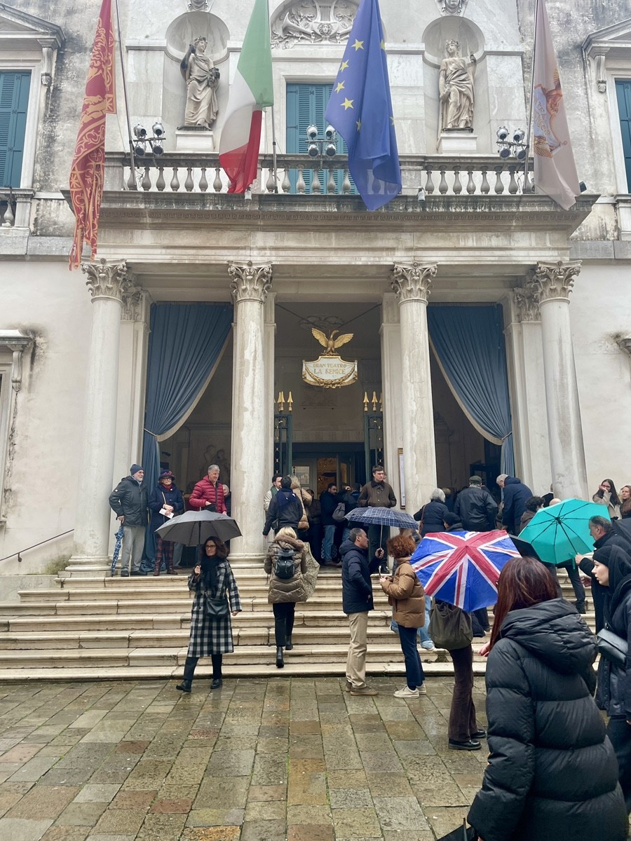 Под дождем театральный фасад кажется особенно белым на фоне серого неба. Толпа у входа — это вечный венецианский ритуал. Здесь, под портиком, люди прячутся от ливня, обсуждая предстоящую постановку или просто впитывая величие места. Синие шторы в проемах добавляют театральности даже самому входу: кажется, что спектакль начинается уже здесь, на улице, и каждый прохожий — его невольный участник. Стоя перед этим фасадом, вы стоите перед памятником человеческому упрямству и любви к прекрасному, которые оказались сильнее огня и времени.
