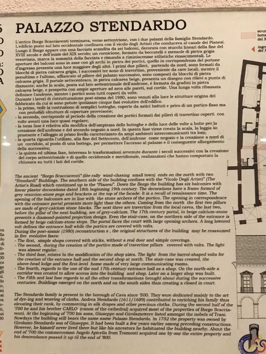 Семья Стендардо присутствует в Борго-ди-Кава с 500 года. Она была в основном посвящена искусству крашения и плетения полотен. Андреа Стендардо (1611-1689) с процветающей торговлей шелковыми шторами и другими драгоценными тканями, накопил необычайное богатство и значительно повысил звание семьи. Во второй половине 18-го века вместе со своим братом Карло, каноническим собором, он приобрел большинство домов в Борго-Скачявенти. Его сыновья Джузеппе и Джироламо в начале 18 века были зачислены в патрициат Трани. Здание, которое до сих пор называется Палаццо Стендардо, является собственностью Джироламо Стендардо, сына Джузеппе, и было построено несколькими годами ранее на предыдущих постройках, но в нем никогда не жил тот, кто, как и его предки, проживал в облицовочном дворце. К концу восемнадцатого века, свергнув Анджело Апичеллу, уроженца Трамонти, он постепенно выкупил всю собственность, и его потомки владели ею до конца 19-го века. в 1752 году появляется
