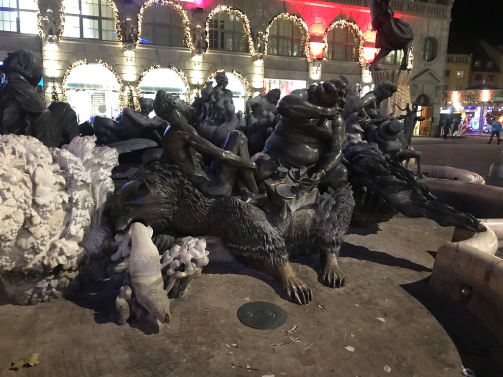 Unveiled to much debate, the fountain vividly depicts the bittersweet realities of married life, bringing Sachs’s lines to life through dramatic bronze sculptures. Scenes of love and quarrel, domestic bliss and strife, passion and monotony unfold in striking detail, evoking a range of emotions from the audience. Among the figures, a wife snatches cake from her gaunt husband while a family perches atop a gluttonous wolverine, a symbol of indulgence laced with irony.